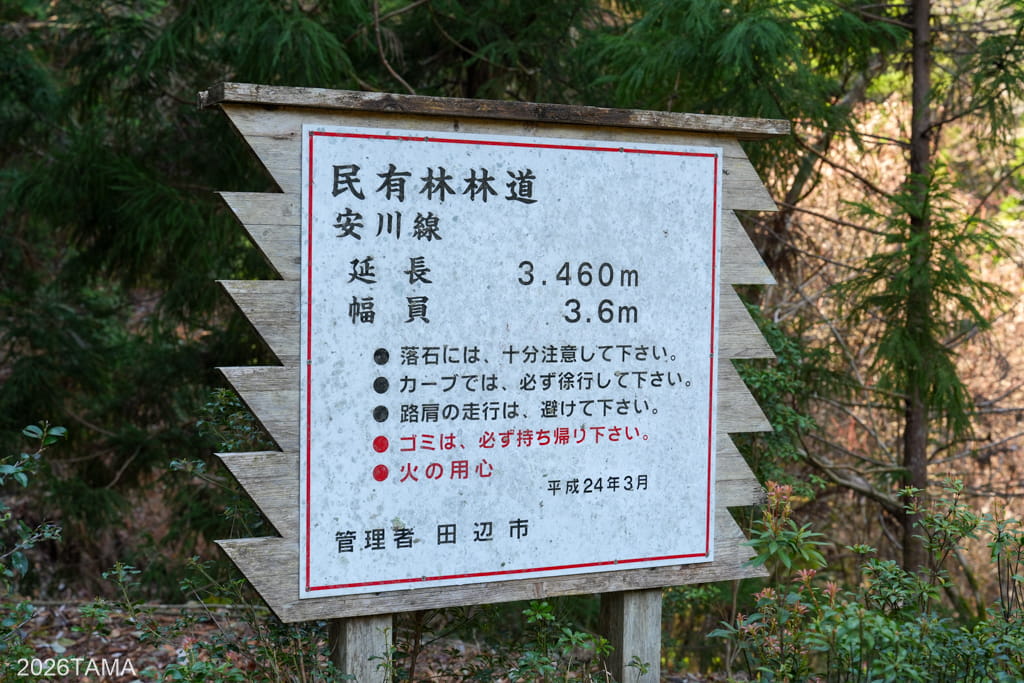 林道安川大塔川線は川湯温泉街の中を通る県道241号(田辺市本宮町静川)と、そこから西へ向かって峠を超えた先の県道219号(田辺市下川上)との間に挟まれた未舗装の林道です。峠の東西で大塔川及び安川の2つの川のほとりを通ることからこの名前が付けられています。道自体が途中で行き止まりになっているわけではないため、東西どちらから向かえばもう片方に完抜けすることが可能。迷う心配も特にありません。