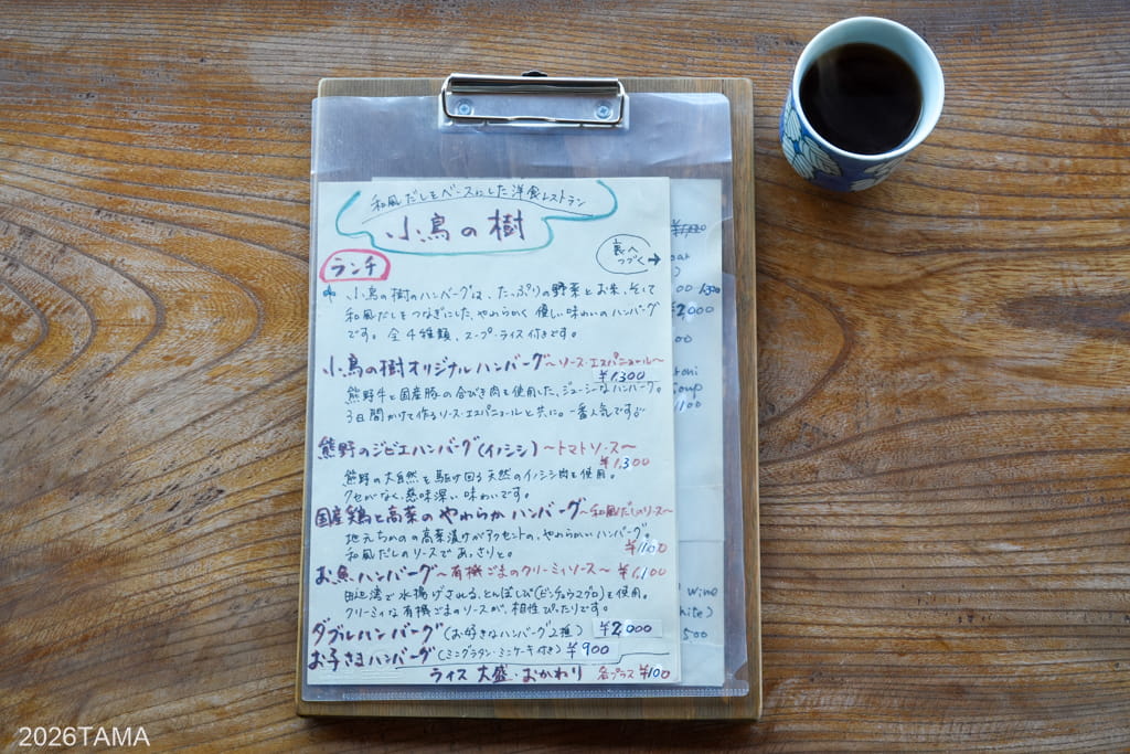 今回のランチ場所に選んだのは、近露王子跡にほど近い小鳥の樹というお店。主に素材にこだわっているハンバーグを提供されているところで、未舗装林道を怪我や事故なく走り終えたのだから肉で祝うべきでしょ、との思いからここにしました。