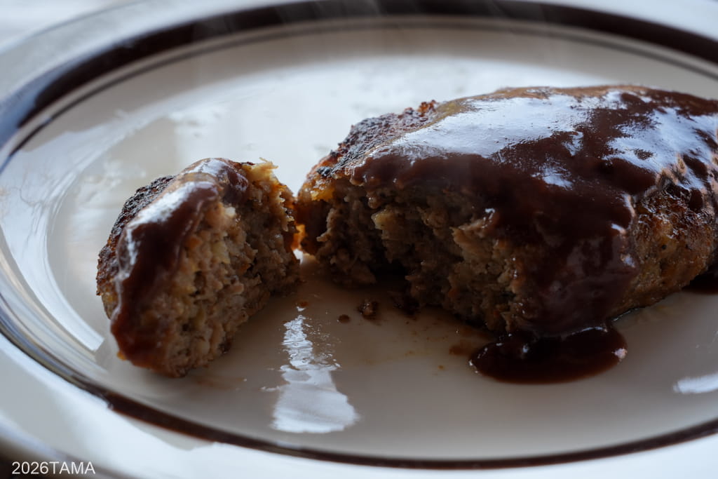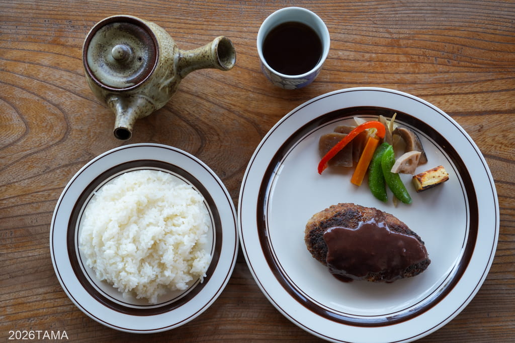 うん、美味すぎる。ぽてっとした膨らみのある形に、ジューシーなのに比較的あっさりとした味わい。このハンバーグとライスを頬張っていると、先程までの林道ライドの疲れが霧散していくようだ。