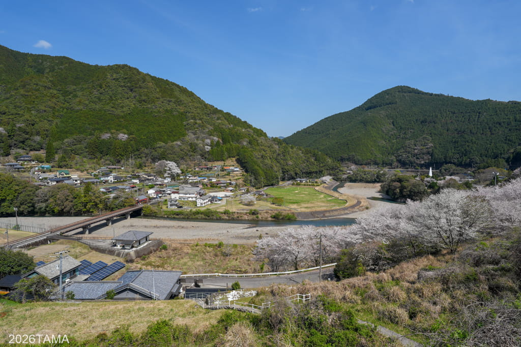 新しめの造りの大杉隧道を越えて山の反対側へ到着。トンネルの前には桜が咲いていて癒されたほか、道の脇にガードレールがあってなんか安心できました。あまりにも限界な道を通ってきた中で、文明レベルがトンネルの東と西で明確に異なっている。