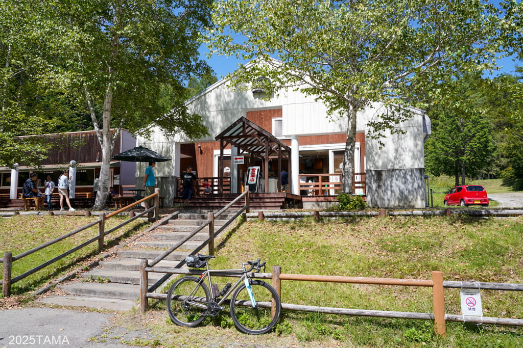 休憩に訪れた開田高原アイスクリーム工房は開田高原の萬谷ファームから毎朝届けられる搾りたての新鮮な牛乳を使用したソフトクリームが有名で、看板が目に入って思わず停車してしまった。どうやら人気店のようで駐車場は常に満車だったけど、こっちはロードバイクなので止める場所は問題なし。