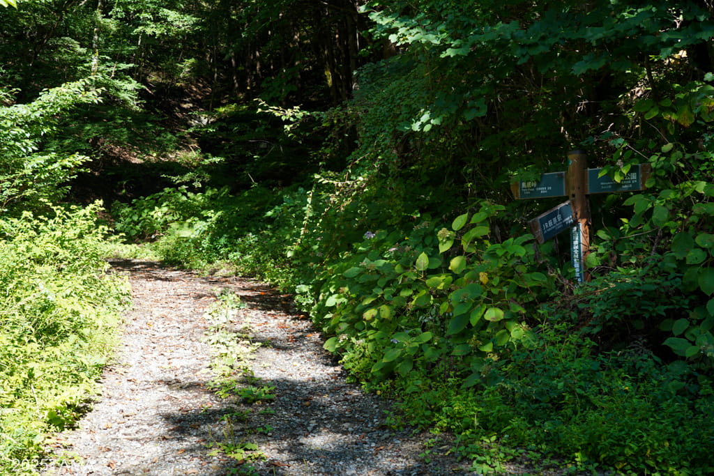 集落から山の中へ入ってしばらく走ったところに分岐があります。徒歩なら階段がある正面へ、自転車の場合は車道(林道?)が左へ伸びているのでそっちへ向かいます。