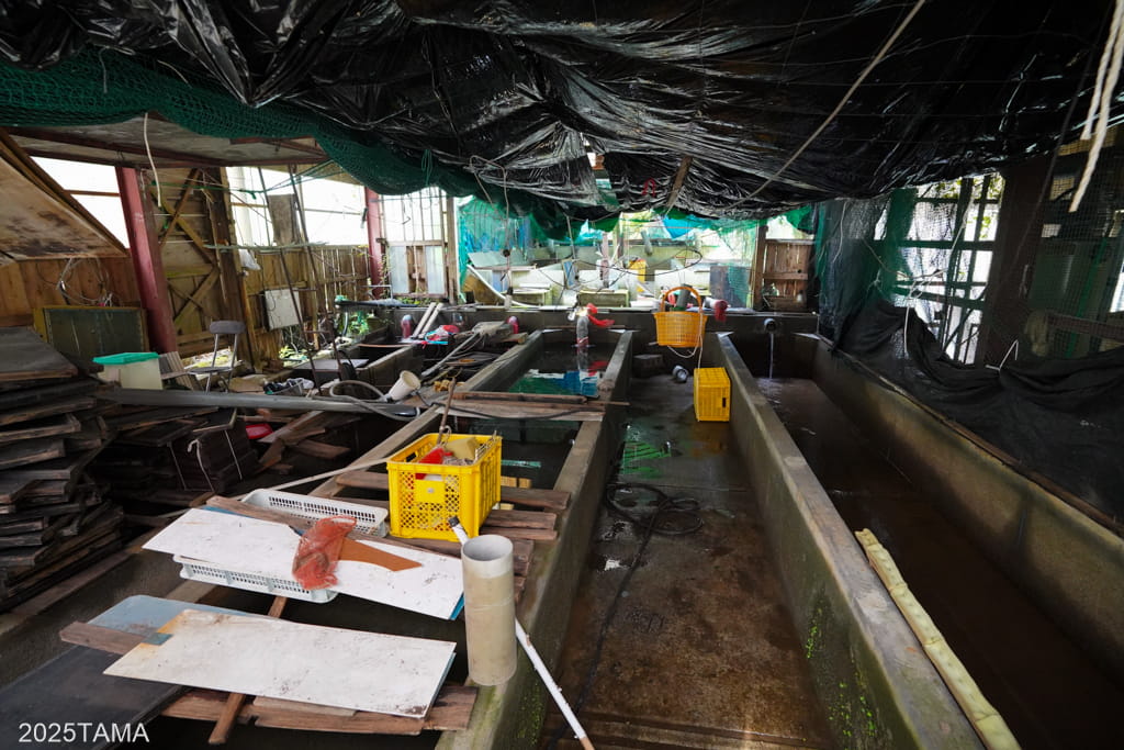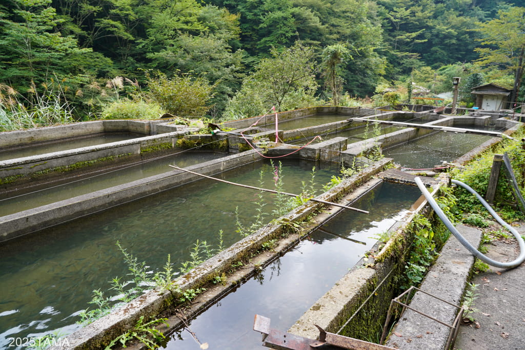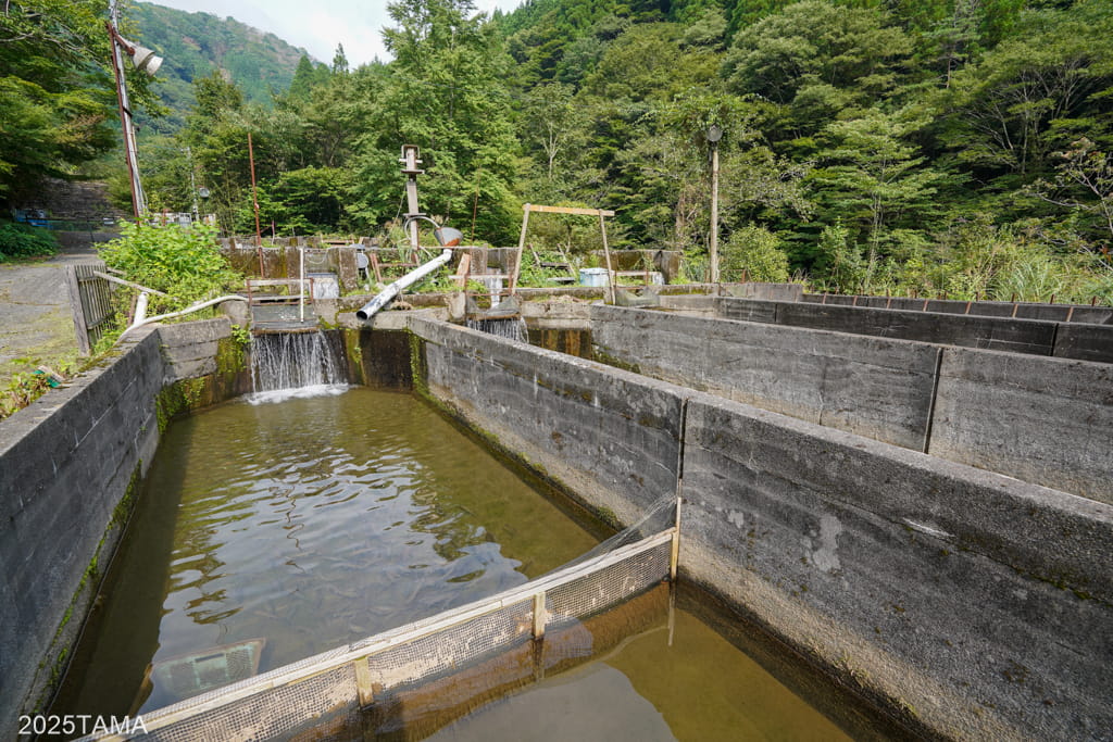 向かって左側には大小20ものヤマメの養殖槽。一番手前だけでも数え切れないほどたくさんのヤマメが泳いでいるのが見えます。ここで育てられたヤマメが近隣の店などで提供されるのだろうか。