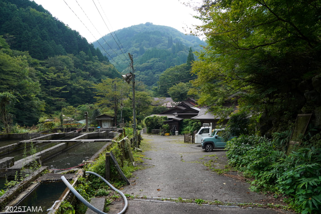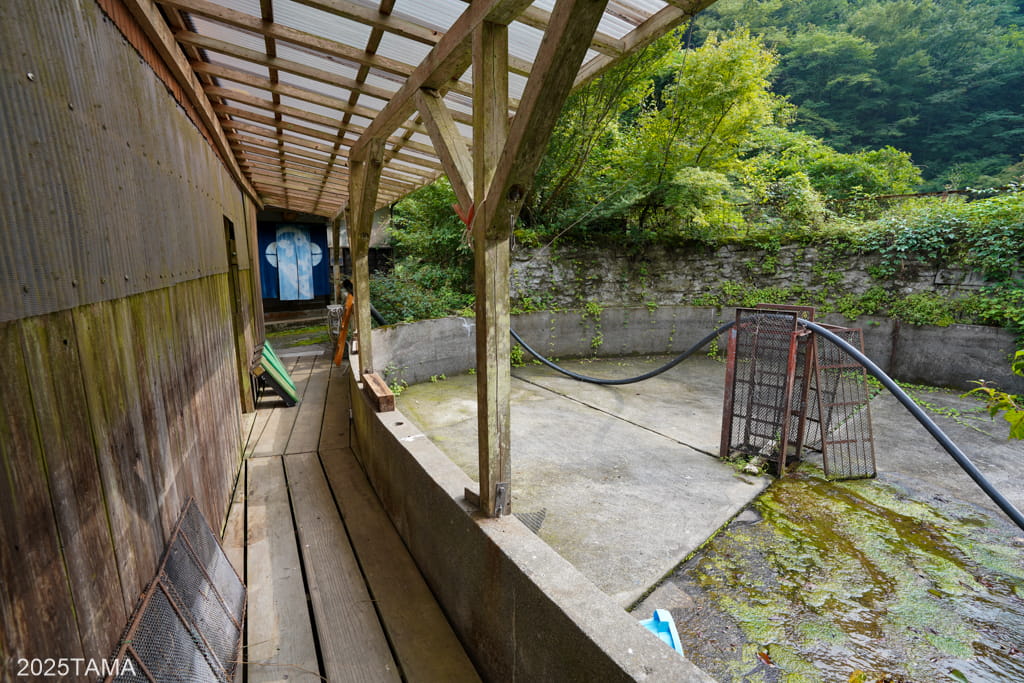 - 約60年前からヤマメの養殖業を始めた。宿の敷地に入って左側にいくつもの槽がある。
