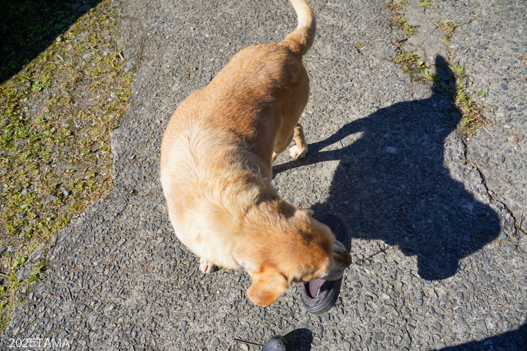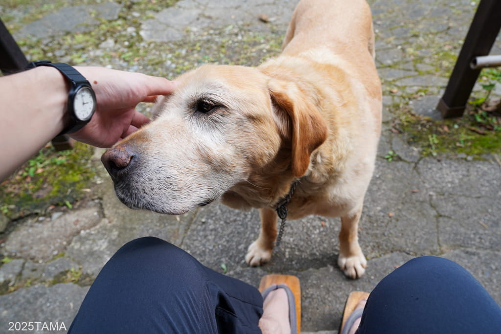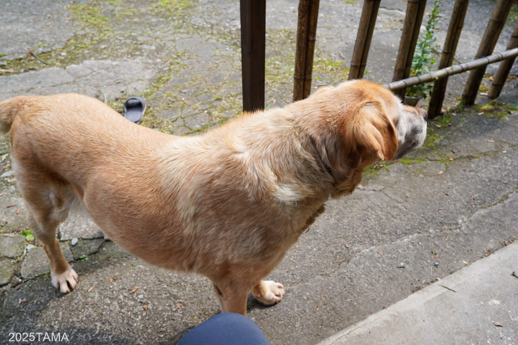 で、敷地内に足を踏み入れると同時にマルちゃんがやってきました。どちらかというと犬が苦手な自分としては吠えないだけでありがたい。