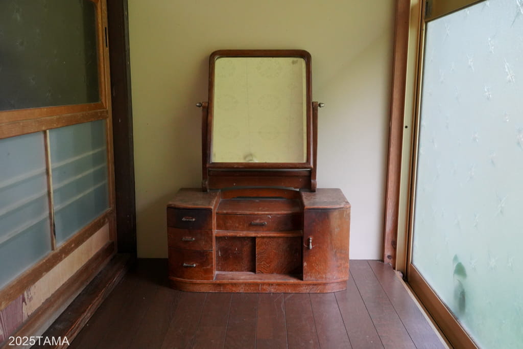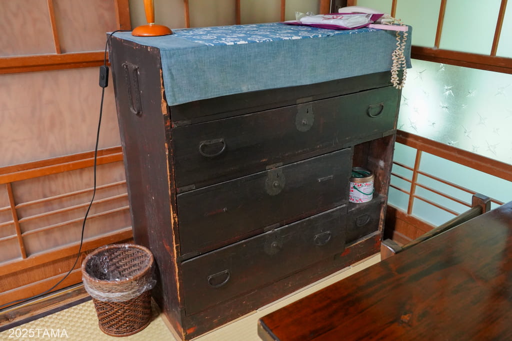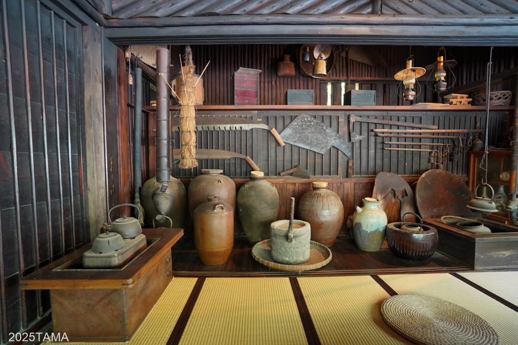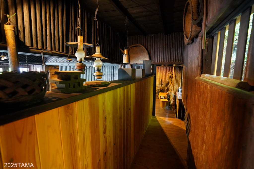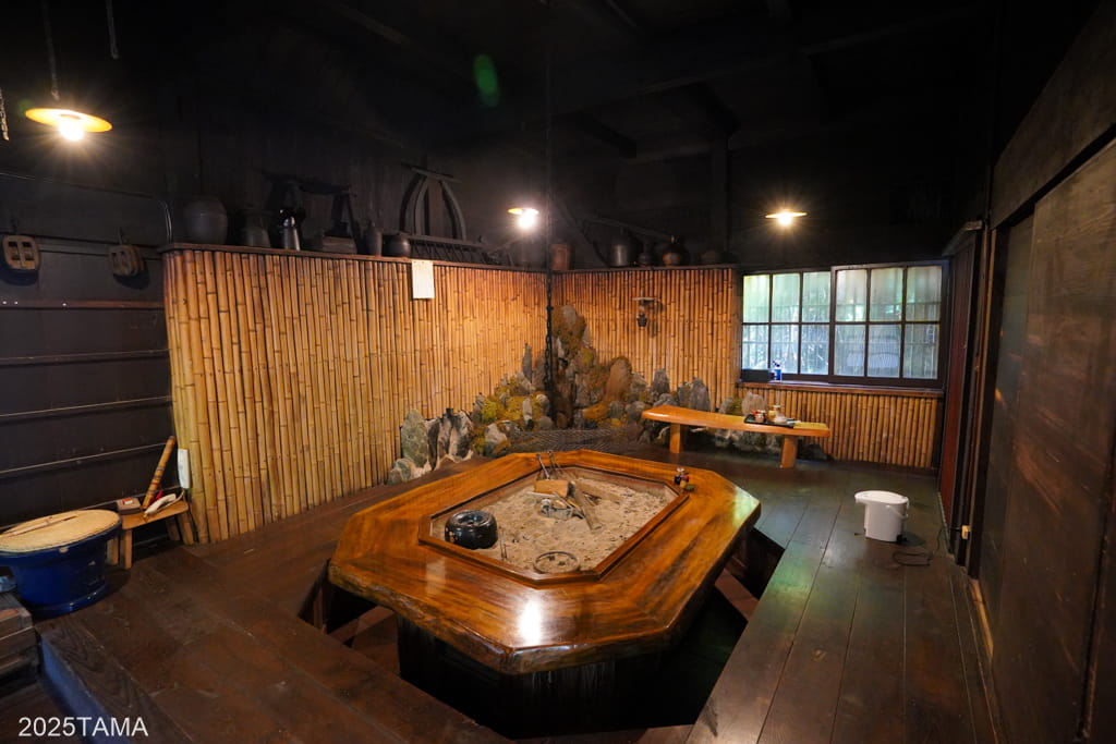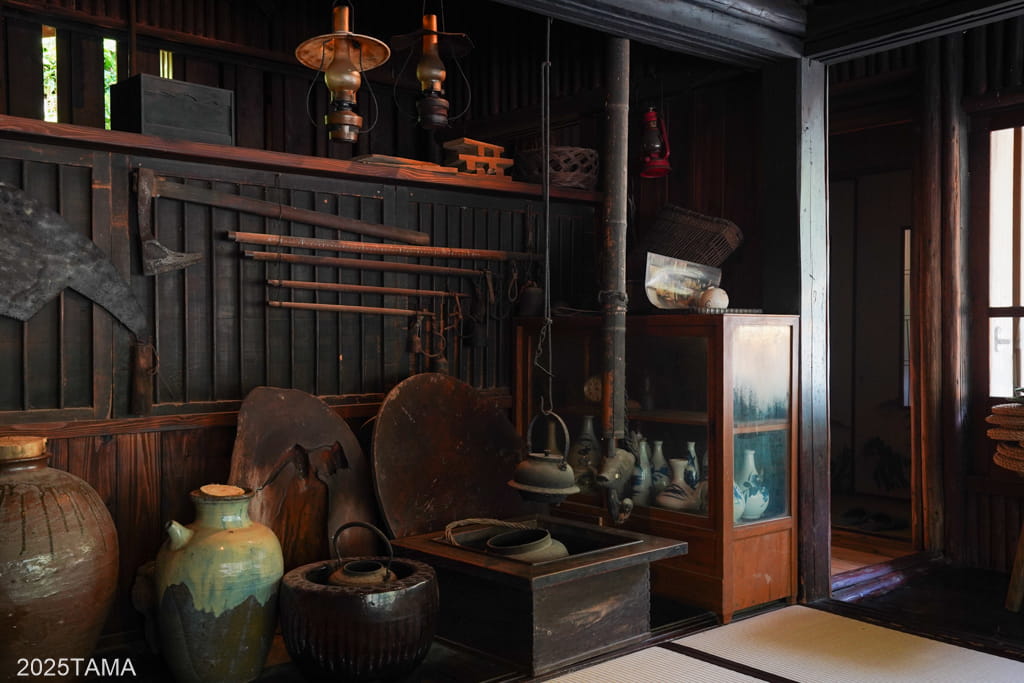 もし掘りごたつの方の間で食事をしている途中にトイレに行きたくなった場合は、道具類が展示されているスペースの奥の通路を通ることで密かに行き来が可能。それぞれの部屋への動線が複数ある点といい、お互いに配慮した構造になっているのがすごい。