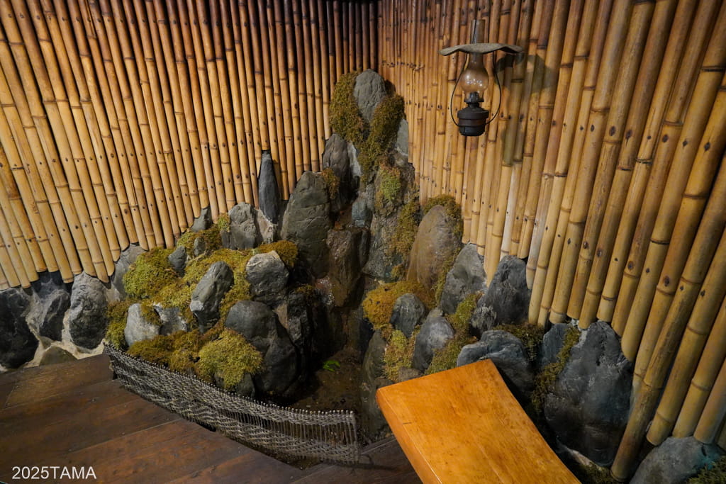 こちらが掘りごたつの間です。畳の間とは異なり板張りで壁には竹の意匠がされていて、両者の雰囲気は全く異なっている。座りやすさを重視する場合はこっちの方がおすすめかな。