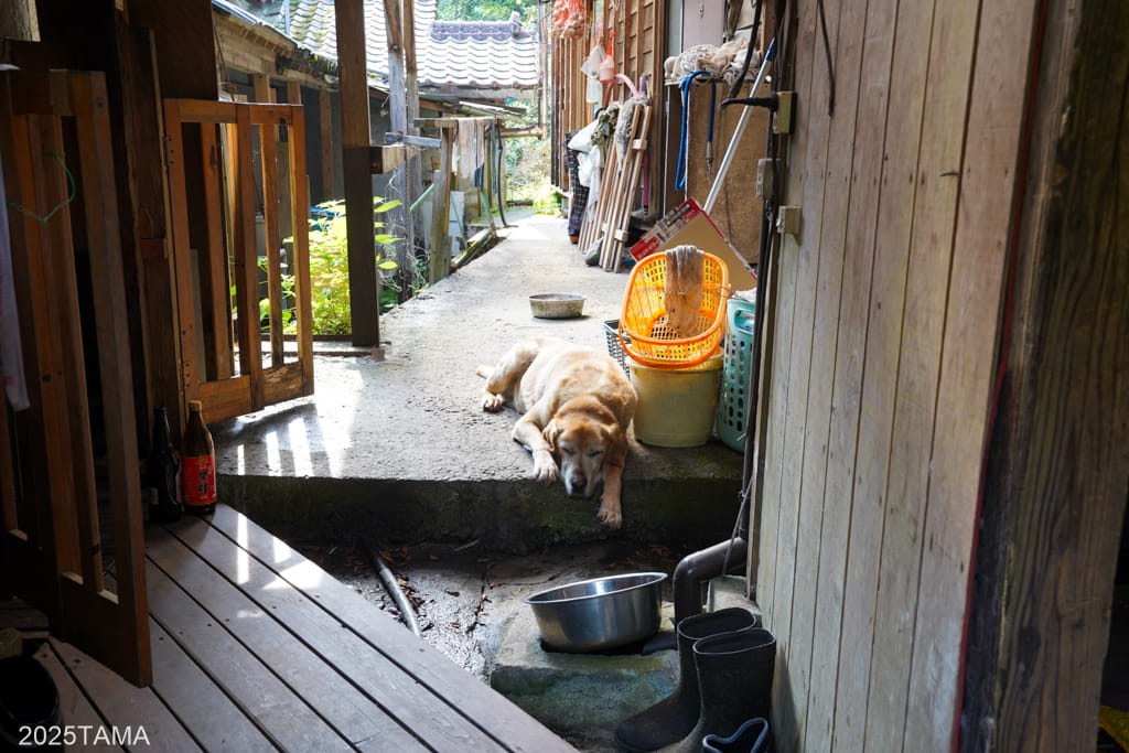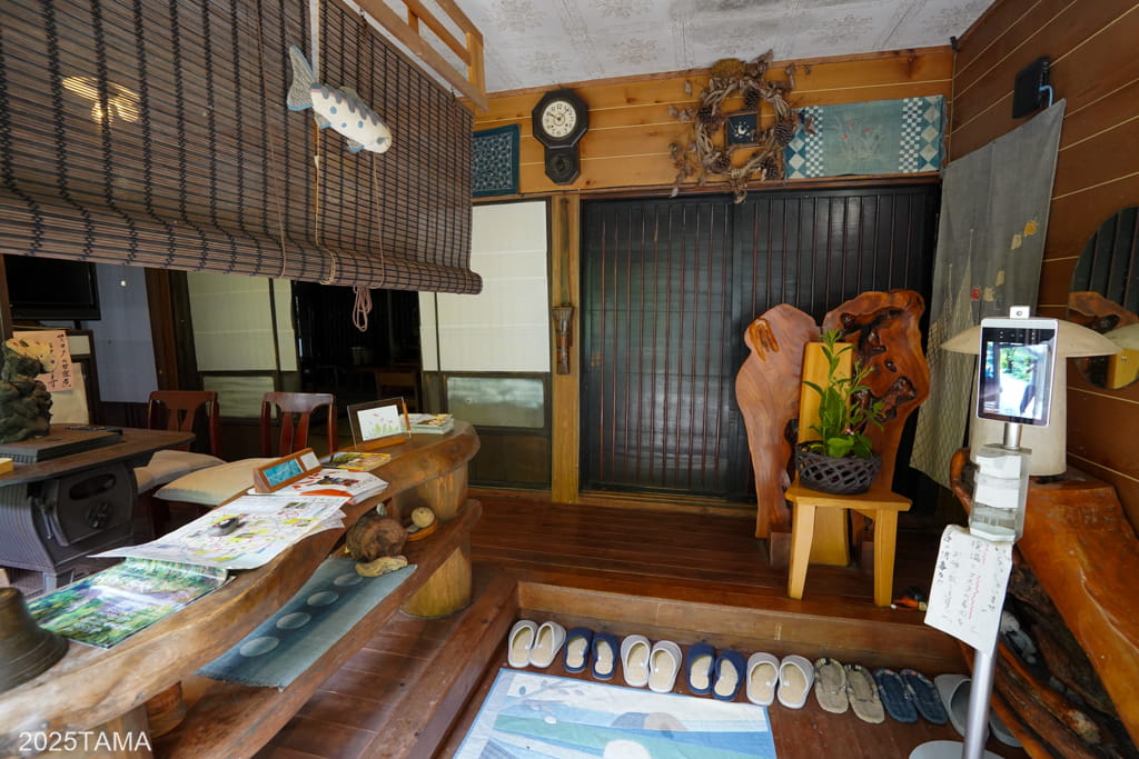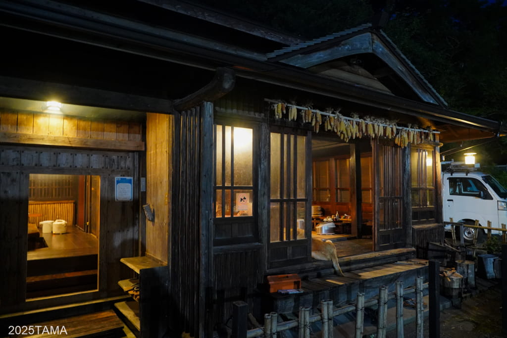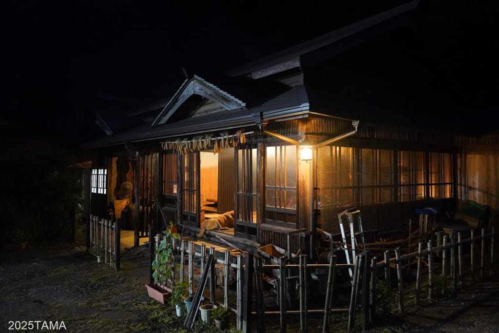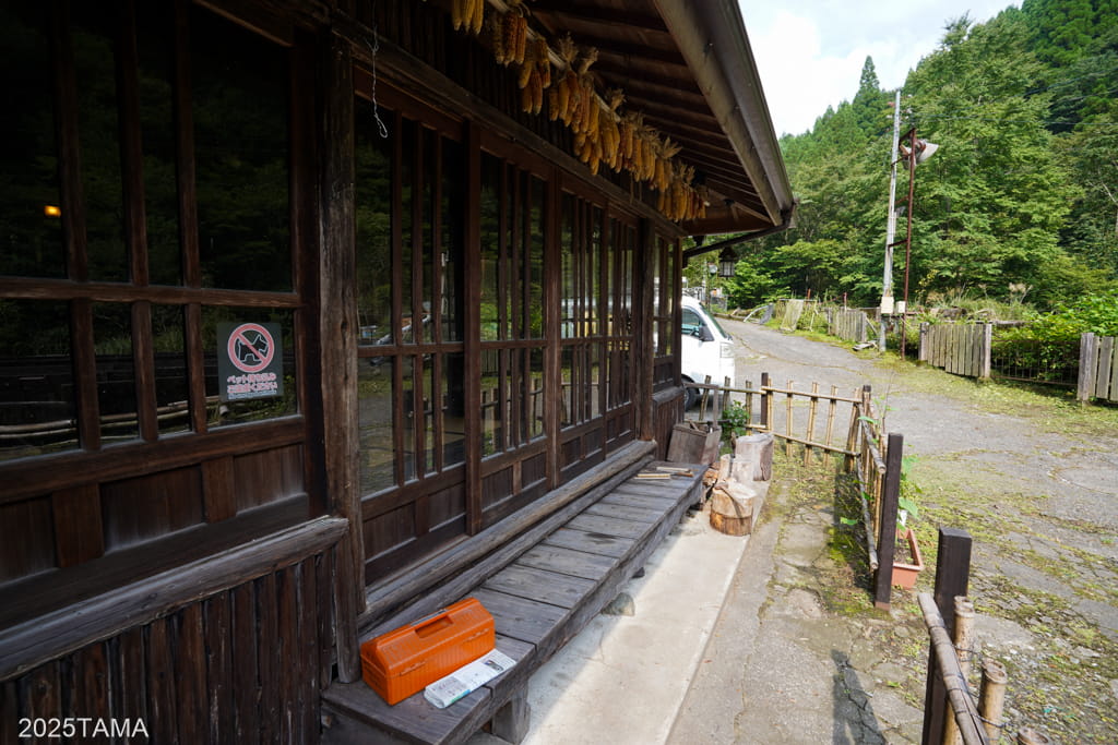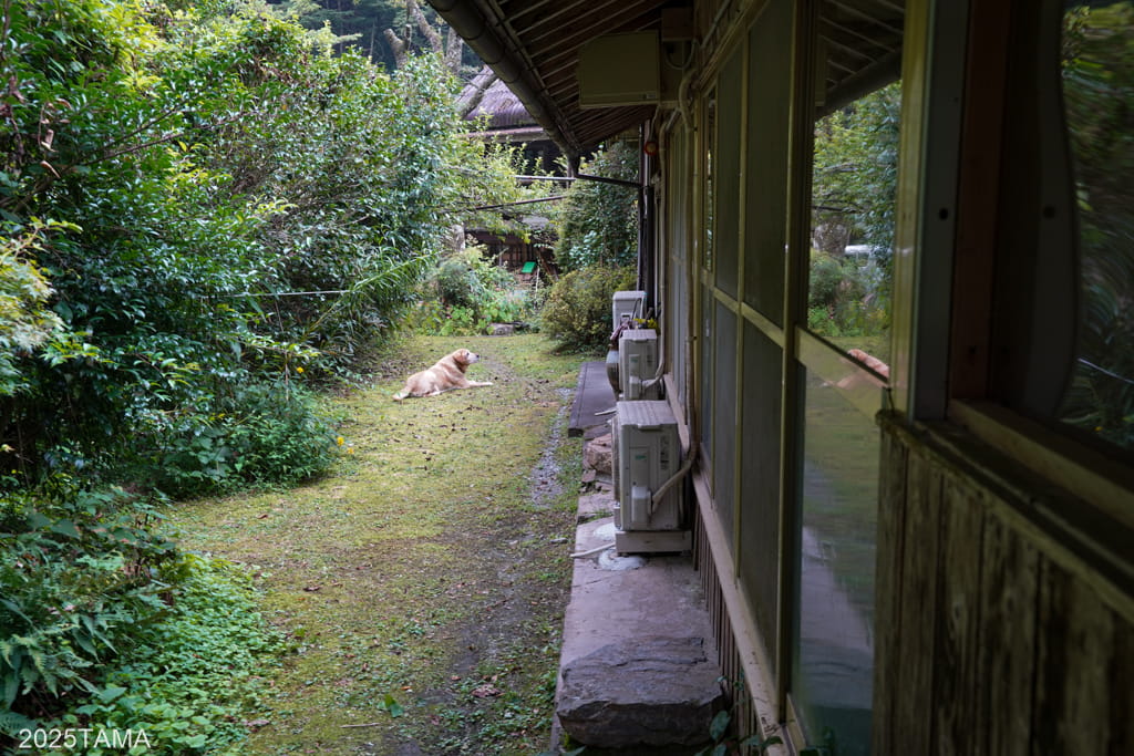 - 現在はご主人と女将さん、それからマルちゃんという老犬(2025年8月時点で14歳)が住まわれている。マルちゃんは吠えないしスリスリしてきたりするしでとても可愛かった。神出鬼没で、主に囲炉裏棟の近くにいる。放し飼いをされていて民宿敷地の出入り口にゲートがある。