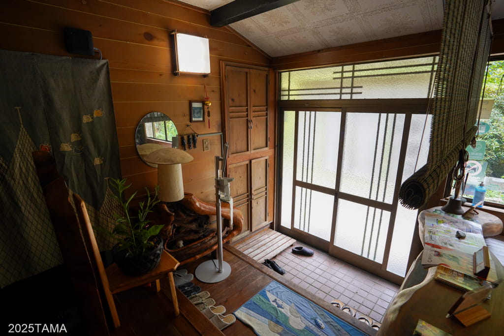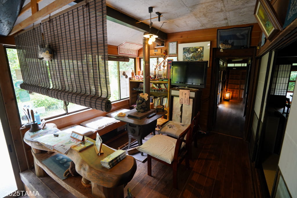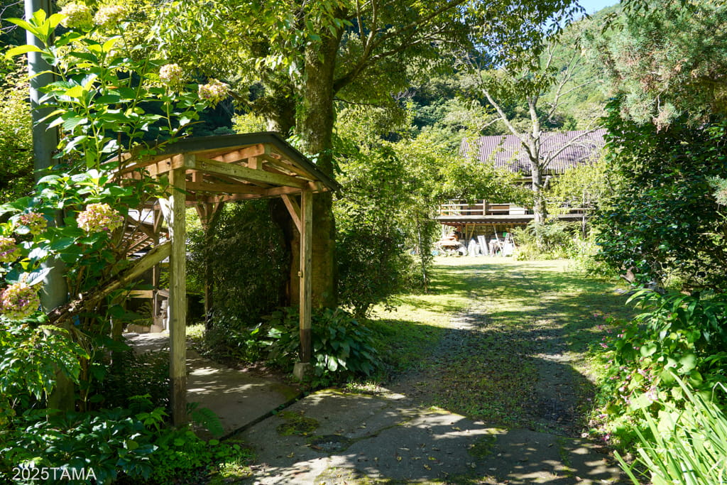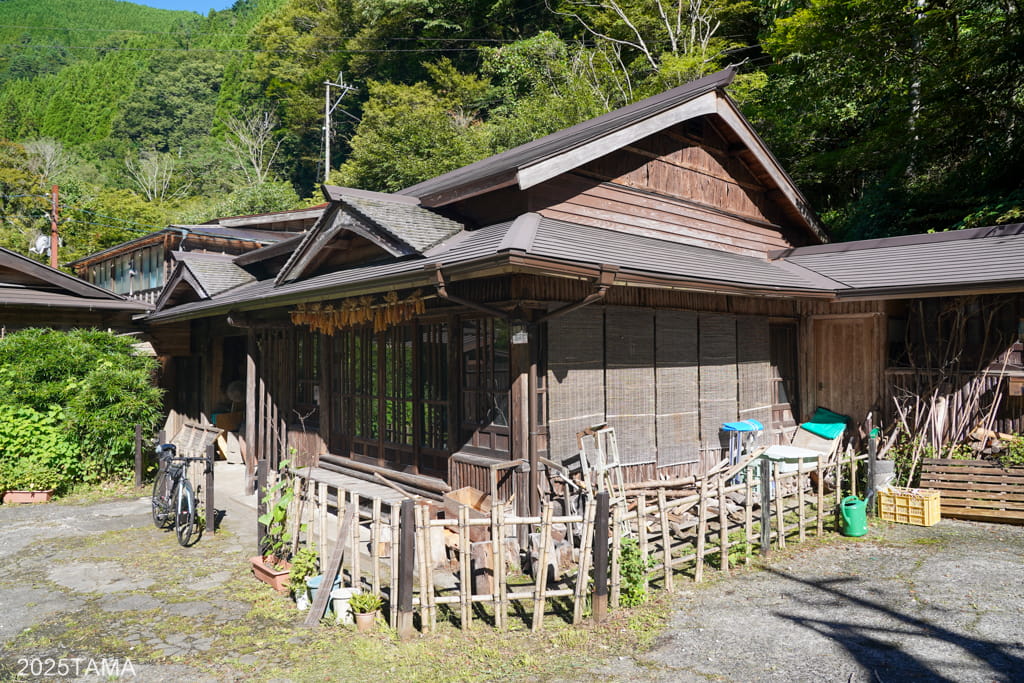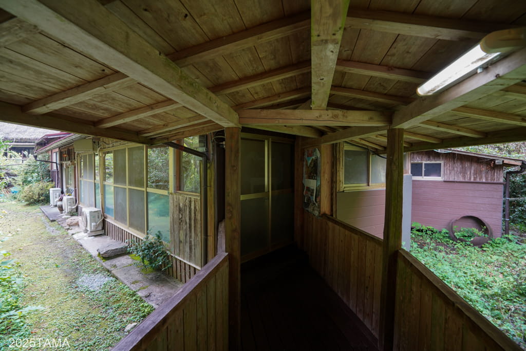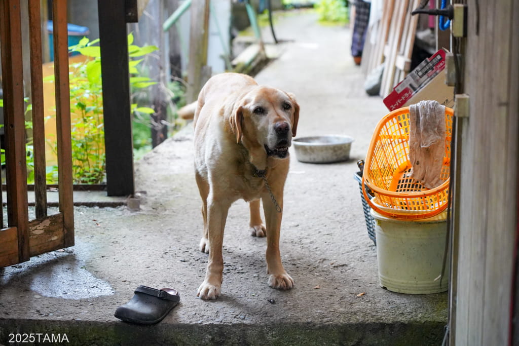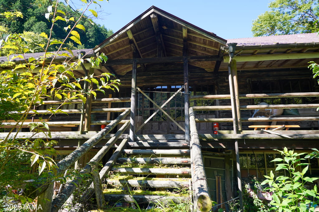 - 現在はご主人と女将さん、それからマルちゃんという老犬(2025年8月時点で14歳)が住まわれている。マルちゃんは吠えないしスリスリしてきたりするしでとても可愛かった。神出鬼没で、主に囲炉裏棟の近くにいる。放し飼いをされていて民宿敷地の出入り口にゲートがある。