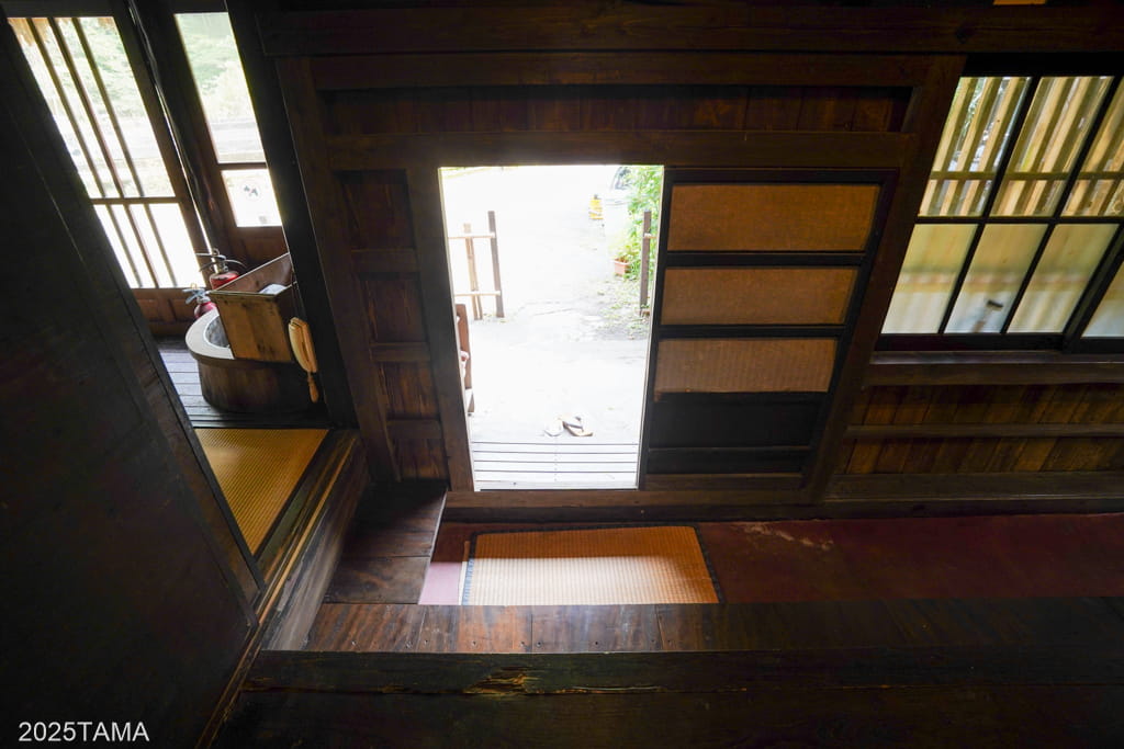 お風呂場までの道中を歩きながら、昔はここ周辺一帯のお風呂はどうしていたのだろうと考えていました。囲炉裏棟や客室棟は独立した隣家だったと聞きましたがお風呂場のスペースは特に見当たらず。もしかしたら洗い場やお風呂場は共同の設備を使用していたのかもしれません。