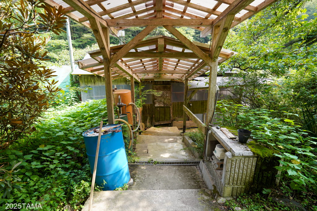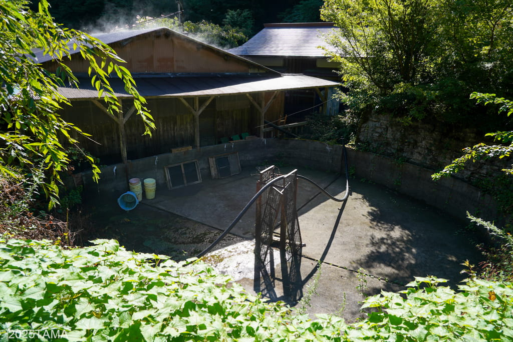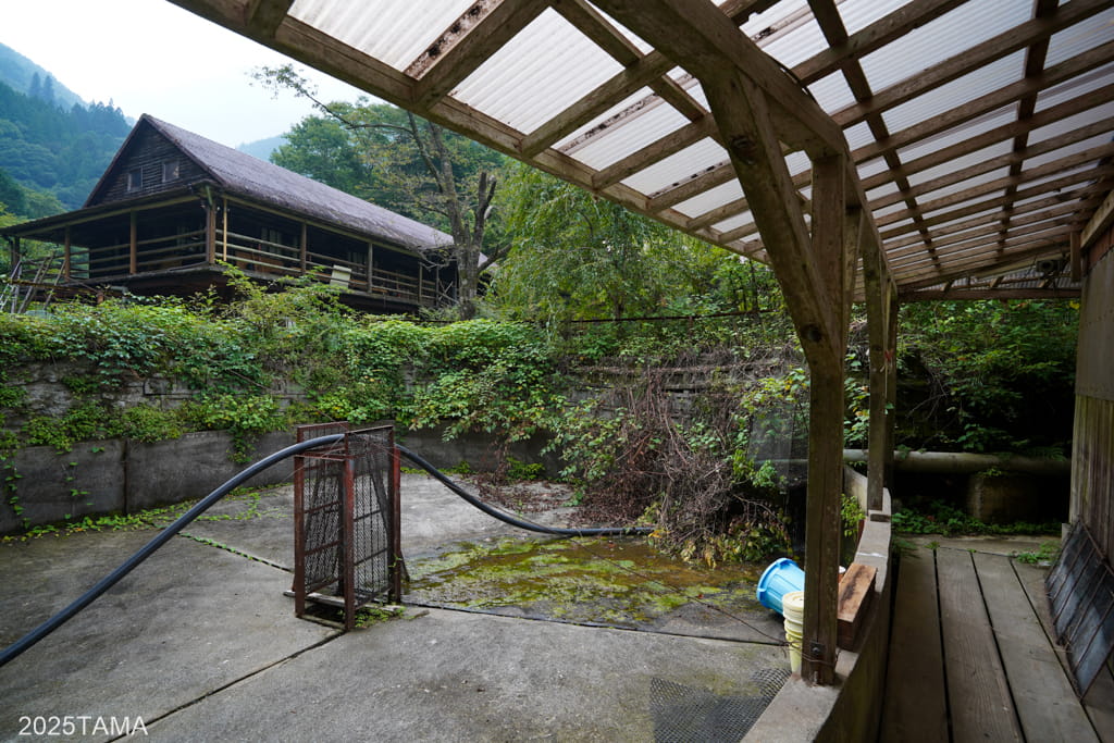 民宿平家荘のお風呂は母屋から道路を挟んで少し離れたところにある建物で、道中には屋内のヤマメ養殖の建物(中には槽がたくさんある)と、右側に円形の大きな槽があります。なおこのお風呂はヤマメ養殖用水を再利用した自家発電装置で沸かしていると説明がありました。