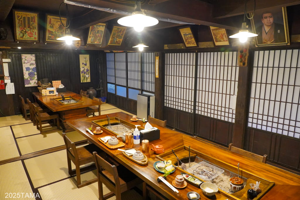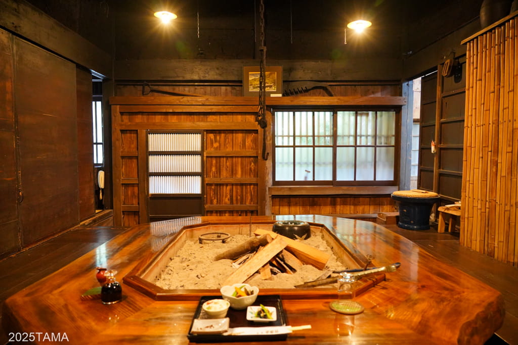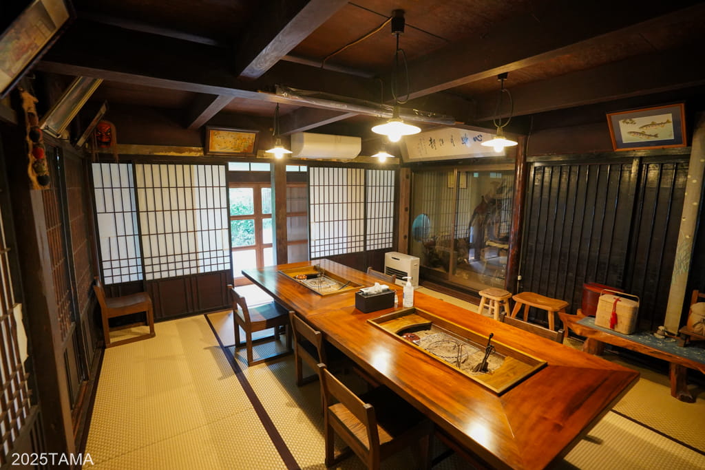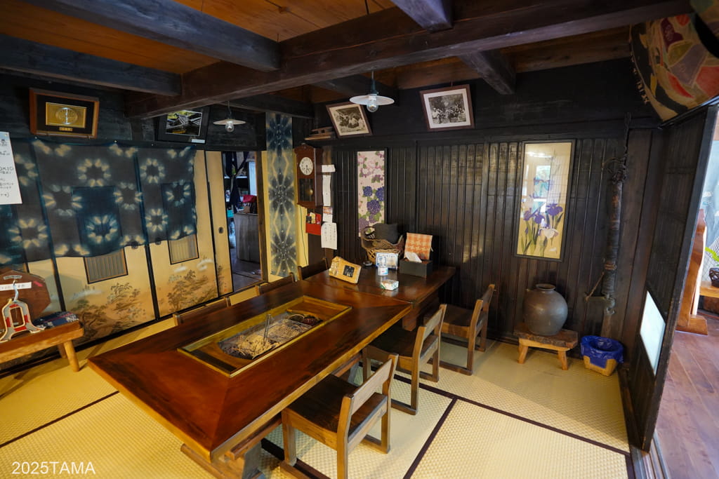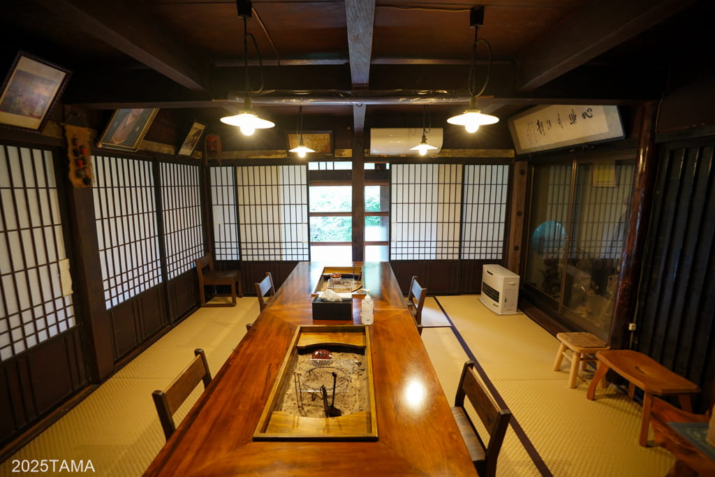 囲炉裏棟は一番手前側にある棟で用途は夕食会場。中央に大きな囲炉裏がある部屋が二つ(手前が畳、奥が掘りごたつ式)と、奥にご主人が蕎麦を打つ部屋があります。