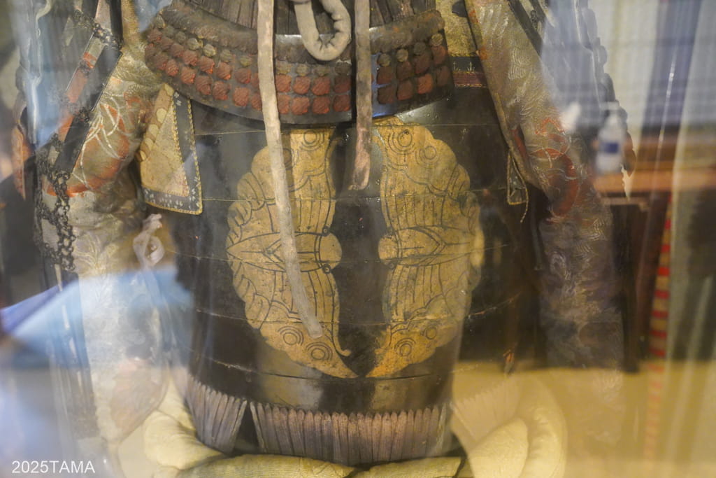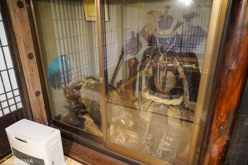 居間の左端にはなんと戦国時代さながらの甲冑(と猪の剥製)が展示されており、ご主人の話によるとこの鎧は平家由来のもの。胴体に「対い蝶」の家紋が描かれているのがその証拠です。どうやら平家の血筋は蝶が好きらしく、二羽や三羽の家紋もあればアゲハ蝶など蝶の種類も色々あるらしい。