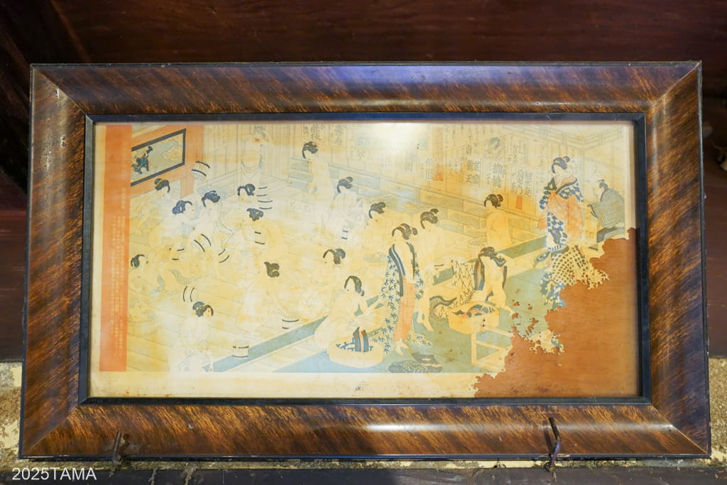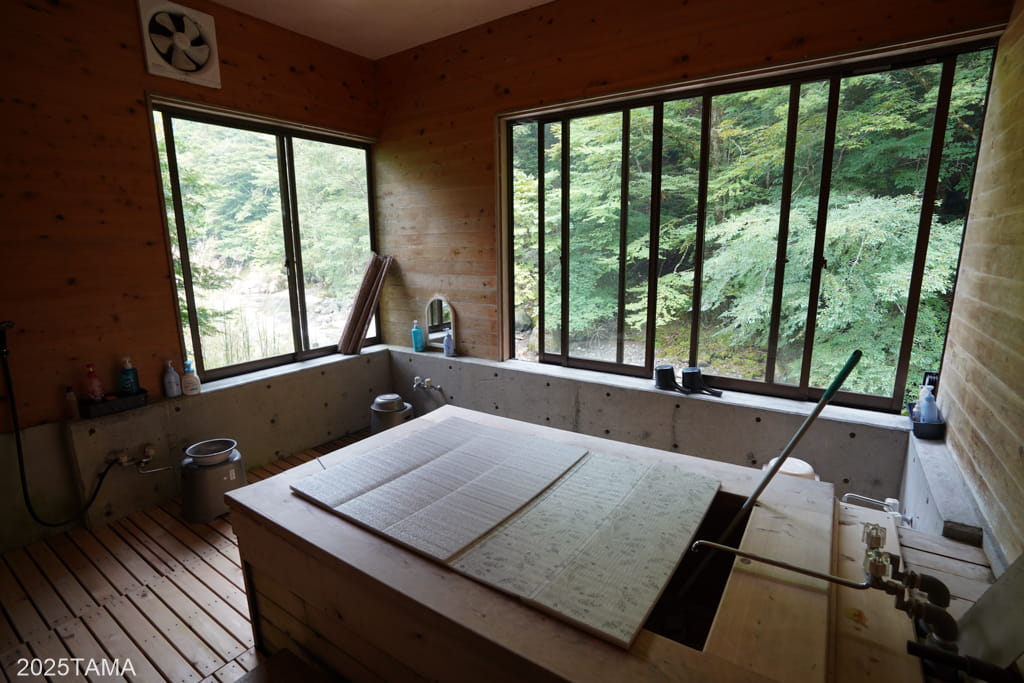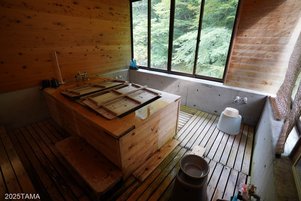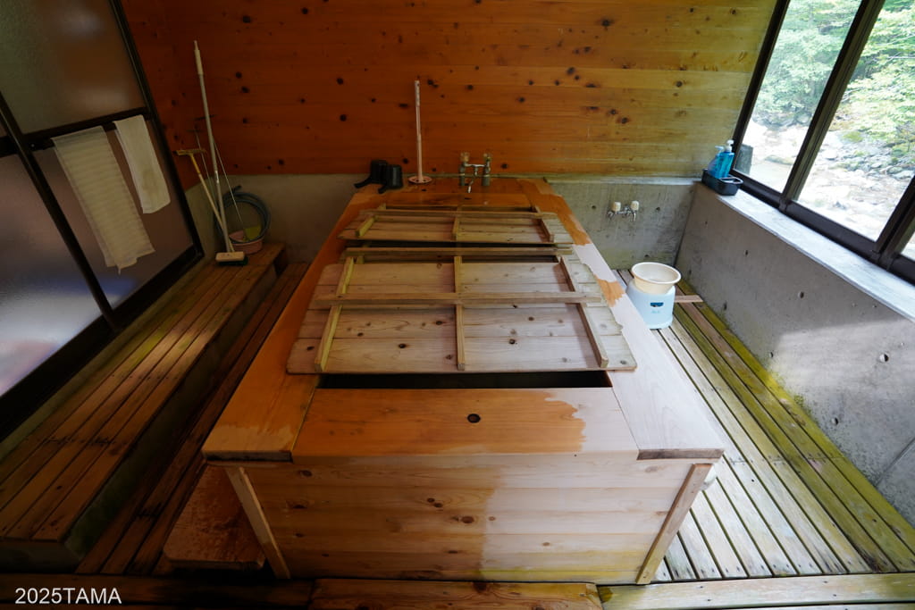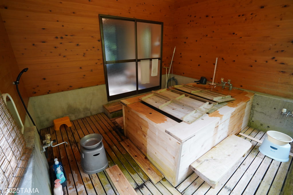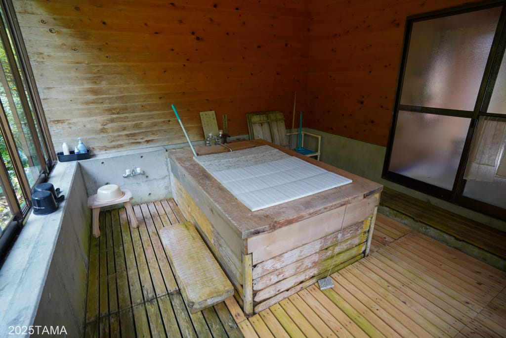 浴室中央に浴槽が配置され、その周囲にスノコが敷かれていました。他の建物と比較すると新しく基礎はコンクリ製で、壁や天井の木材も滑らかです。