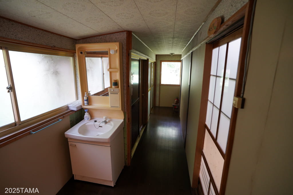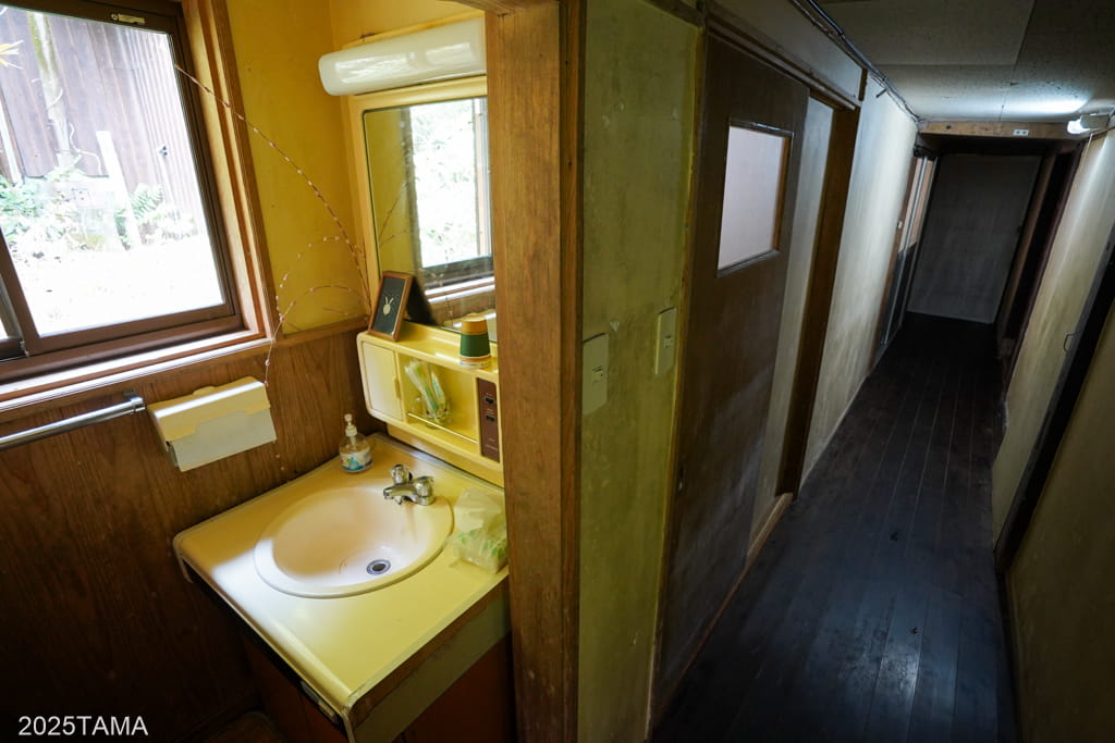 廊下を歩いて曲がり角を曲がり、直進すると洗面所と2階への階段。階段の手前で左を向くと宿泊棟への渡り廊下があります。洗面所の前を奥へ向かうと居住棟へと繋がっているようです。