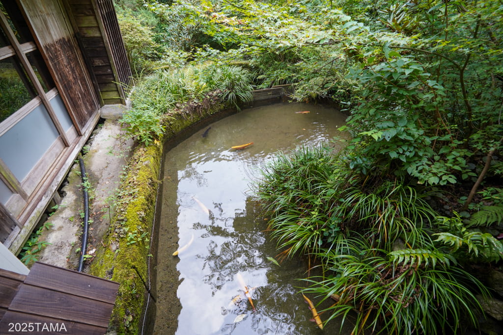 渡り廊下の左側には鯉が泳いでいる池があります。