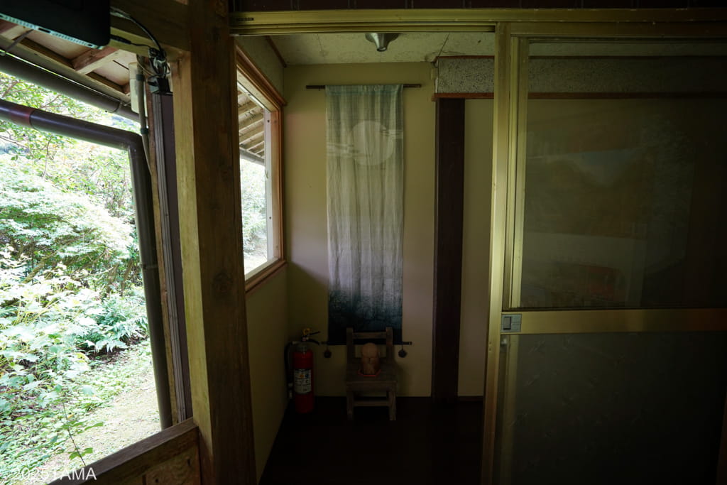 浴室からは近くにある渓流が見え、せせらぎの音も聞こえてきます。というか平家荘の周辺環境で唯一聞こえてくる音がこのせせらぎの音くらいしかなく、静寂が支配する山の中に自分は居る。この渓流は下流へ流れていくと国道445号近くに合流するため、昔は川上から箸やお椀が流れてきて隠れ里の存在が発覚した…ということもありそうだ。