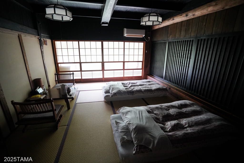 宿泊する宿らしからぬ古風な雰囲気にとても興奮してしまった。部屋の中央にある大きな囲炉裏、天井付近まで真っ黒になった材木、そして屋外と屋内の明暗差。ここで食事をいただけると思うと、夜の時間がなおさら待ち遠しくなるというもの。