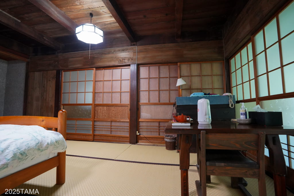 客室内に入るまでは和室+敷布団という図式を想像したのに対し、実際には床こそ畳であるものの、ベッドや椅子、机が置かれていて現代に対応されている感があります。特に椅子や机はシンプルに座りやすく、年配の方でも問題なし。