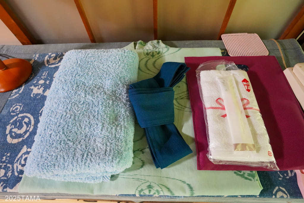 設備はエアコン、ポット、内線とコンセントがあり、アメニティは浴衣、タオル、バスタオル、歯ブラシが揃っています。またauの電波は圏外ですがWi-Fiが整備されていて嬉しい。