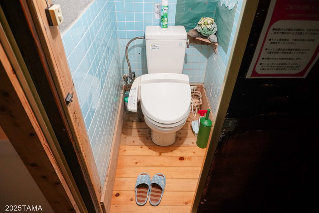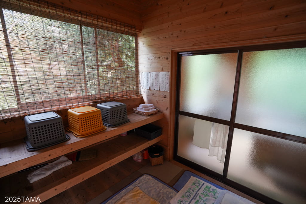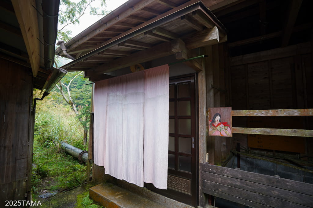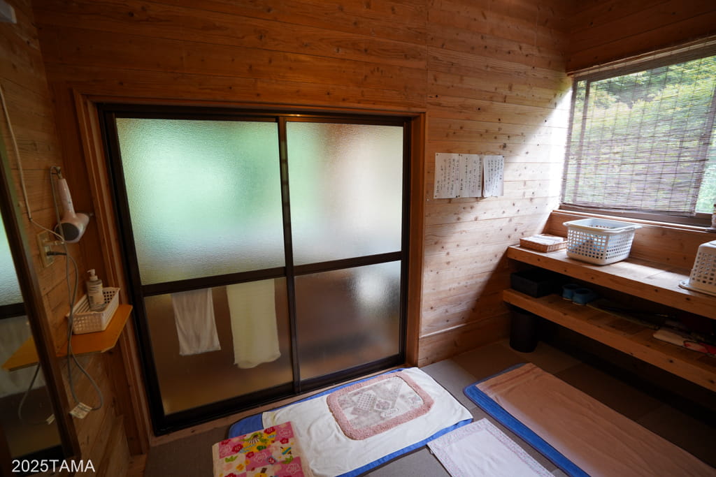 お風呂場の建物の前までやってきました。表示上は右側が男湯、左側が女湯となっています。現在では基本的に宿泊する組ごとに浴室を使い分ける形で、本日は自分が男湯、もう一組(福岡から釣り目的で訪れている二人組の常連客)は女湯の方を使うことに。