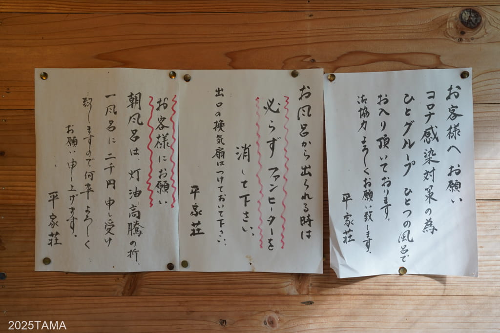囲炉裏棟の外観は現代の建物とは毛色が全く異なっていたのに対し、母屋は一般的なガラス戸や玄関の引き戸など、どこか親戚の家にやってきたような安心感を感じました。暖簾の「民宿平家荘」の淡い文字も好きです。