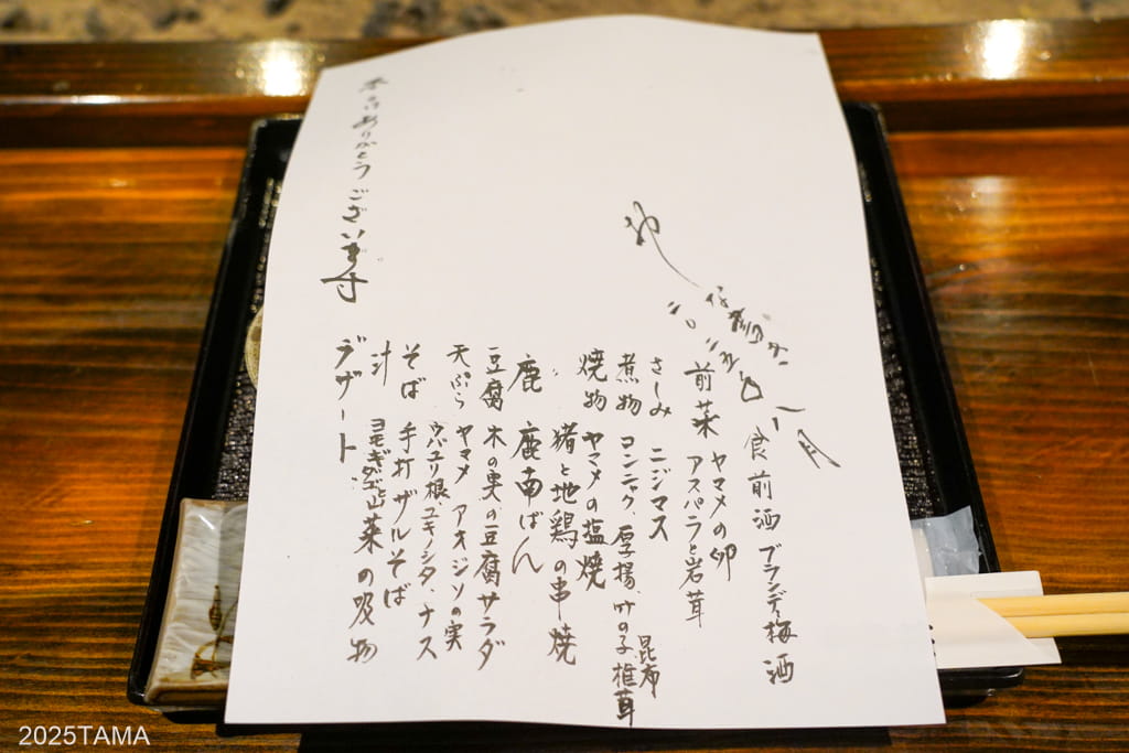 すでに書いた通り、夕食会場は畳の囲炉裏の間となります。料理の内容は上記の内容をベースに月によって異なり、2025年8月のお品書きは以下の通り。