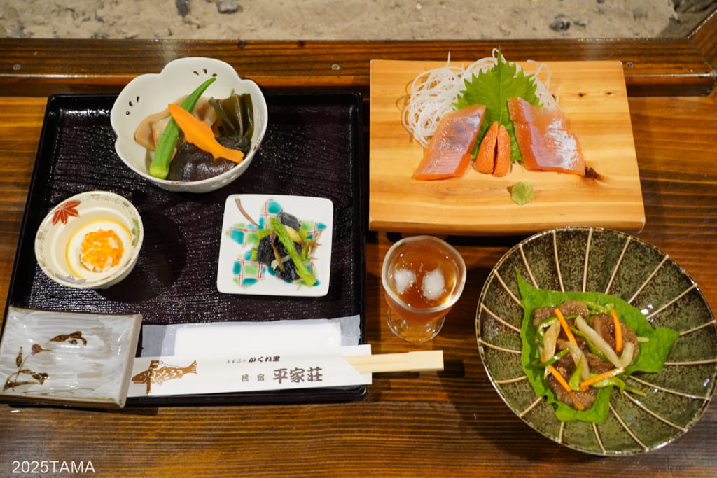 平家荘の夕食は京丈山の清流で育てているこだわりのヤマメをはじめ、山菜、猪、鹿、地鶏等五家荘の自然が育てた四季折々の料理、さらには自家製の豆腐、こんにゃくや手打ちそばを味わうことができます。自分が今回の滞在で一番感動した要素がこの食事にあって、食事だけを目的にまた再訪したいくらい。