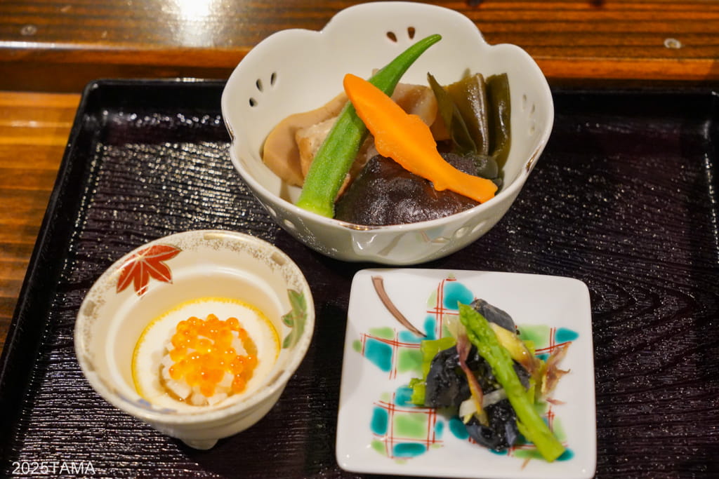 - 前菜:ヤマメの卵、アスパラと岩茸