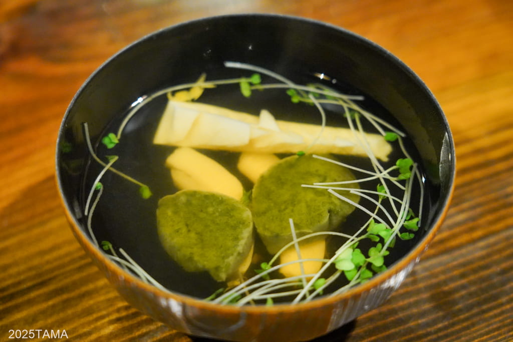 - 汁:ヨモギ団子と山菜の吸い物
