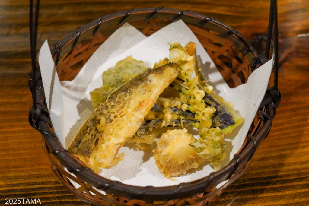 - 天ぷら:ヤマメ、青ジソの実、ウバユリ根、ユキノシタ、ナス