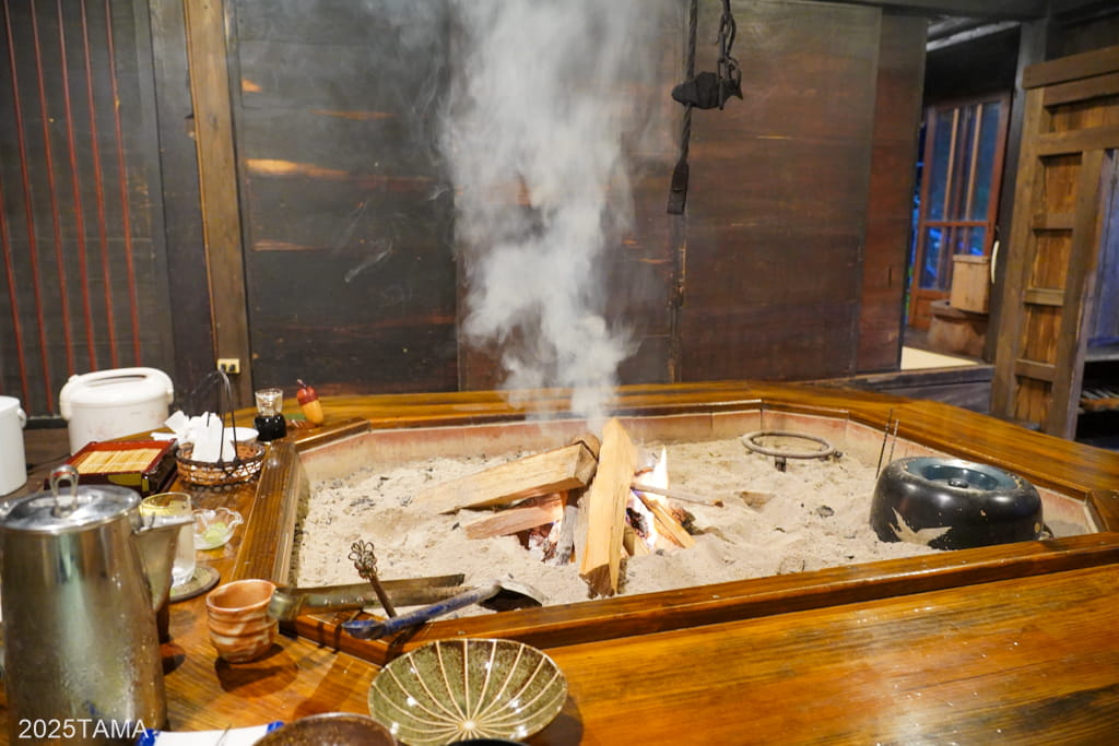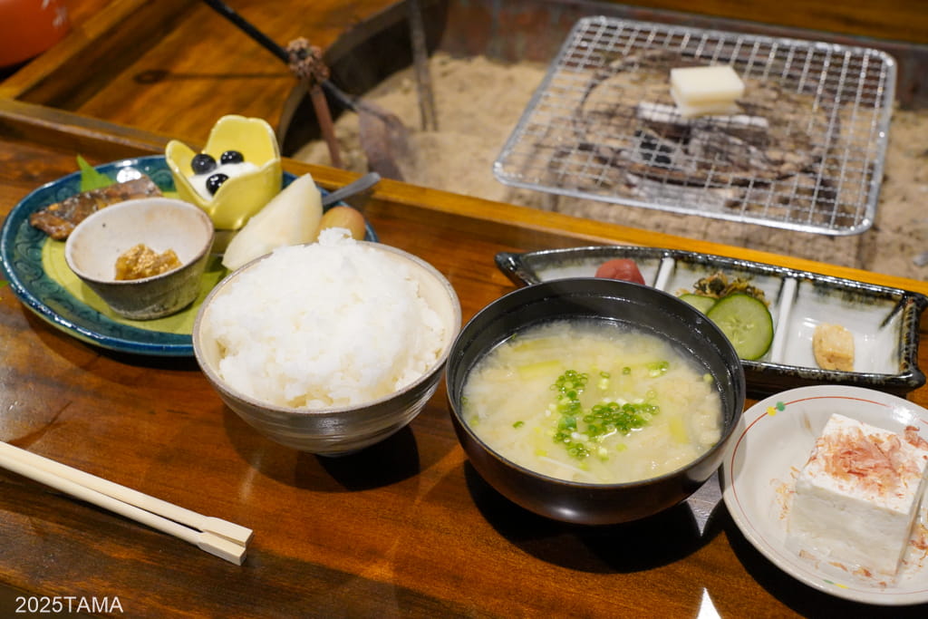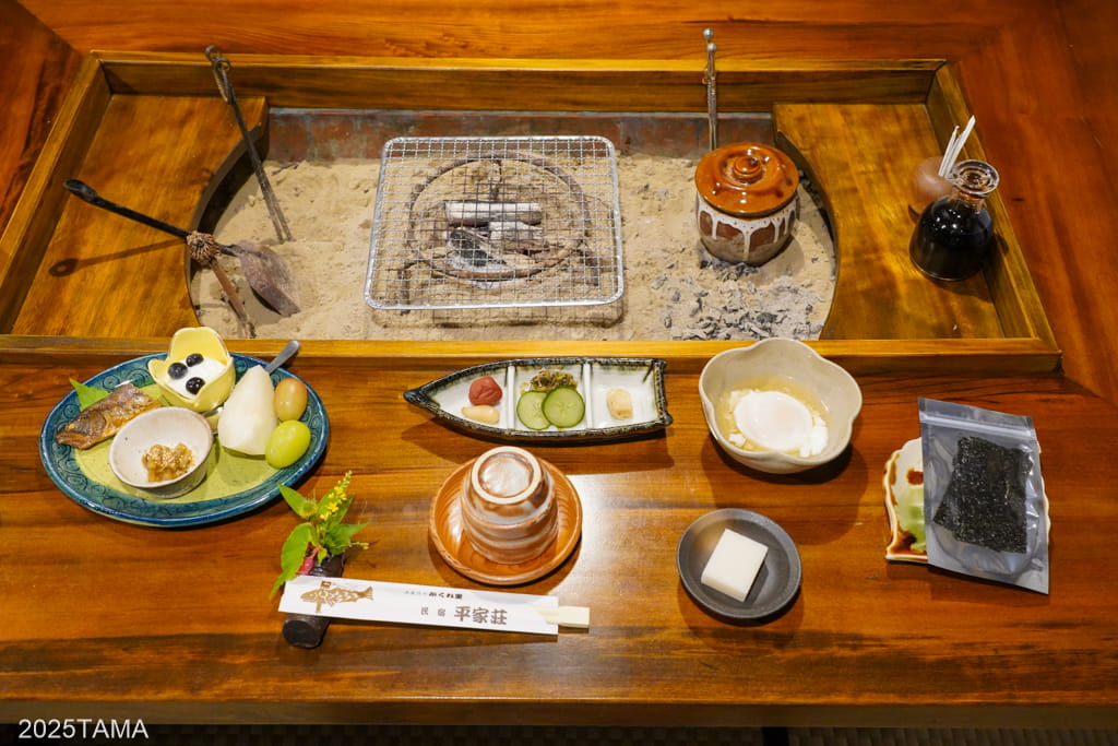 現代における旅館でもそうですが、夕食用ならまだしも朝食用に囲炉裏を使うことはまずありません。しかしここでは朝食においても焼き立ての料理を味わってほしい、との思いから囲炉裏を設けてある。なんて素晴らしいことだ。