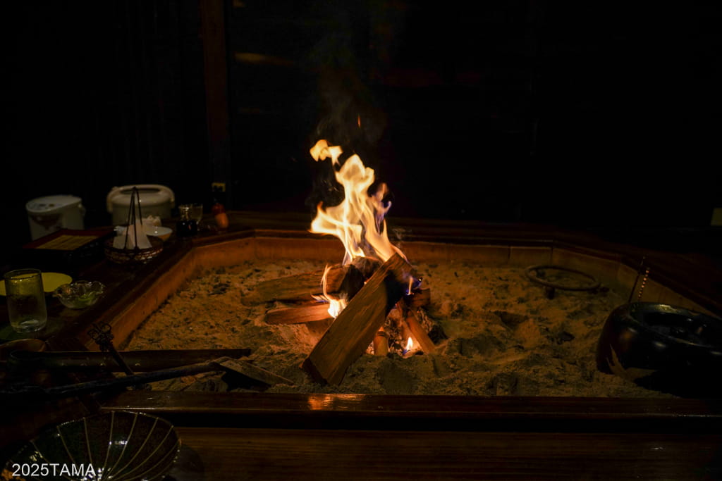 ずっと昔から平家荘ではこの囲炉裏を囲んで食事をとっていたわけで、パチパチと燃え上がる火を見つめているとこの宿の歴史が浮かんでくるようでした。周りには人工的な明かりがない中での火の安心感がすごい。人間本来のDNAにあるものを思い出させてくれるようです。