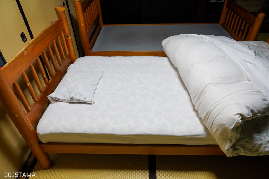 さて、今回泊まったのは一番手前に位置する「かたくり」の部屋で、広さは10畳+縁側に廊下が別途設けられています。押入れの前にベッドが二つ置かれており、一人でも二人でも柔軟に対応できる様子。和室に敷布団ではなくベッドなのが新鮮でしたが、これはもともと隣にあるロッジで使用されていたものだそうです。