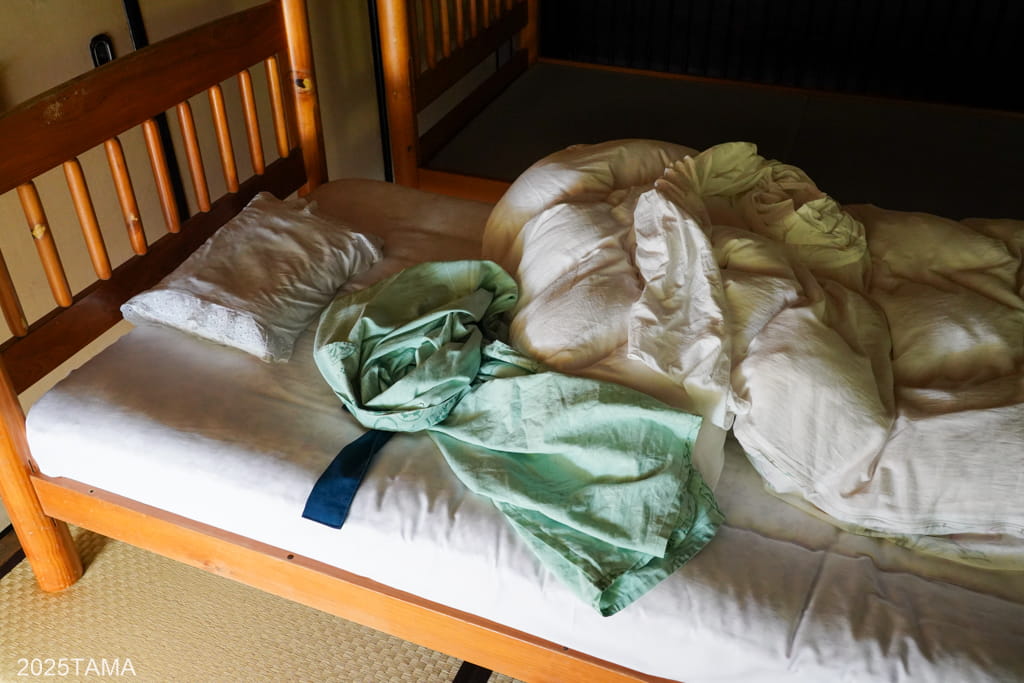 お腹いっぱいになったところで客室へ戻り、他にすることもないのでそのまま就寝。満腹状態で布団にインできるシチュエーションが本当に幸せすぎる。夜はエアコンなしで問題なく過ごせるほど涼しくて安眠できました。部屋からは川のせせらぎがわずかに聞こえてきて、虫についても時期と環境の割には少ないのと、客室内には出ませんでした。