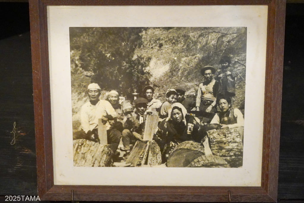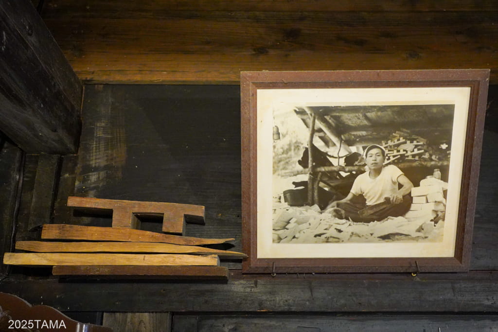- 古くからこの辺りには炭焼きや木地師の人が来て仮住まいをし、山に関する仕事で生計を立てていた。ご主人の父親もその仕事をされており、当時の写真が朝食会場に展示してある。父親はここで切り出した木材を使って下駄の制作をやっていた。荒削りまで済ませた下駄を人力で美里町まで運搬し(昔は美里に下駄屋が多かった)、交換品として得た米や味噌等の物資を畳に乗せてまた上っていた。