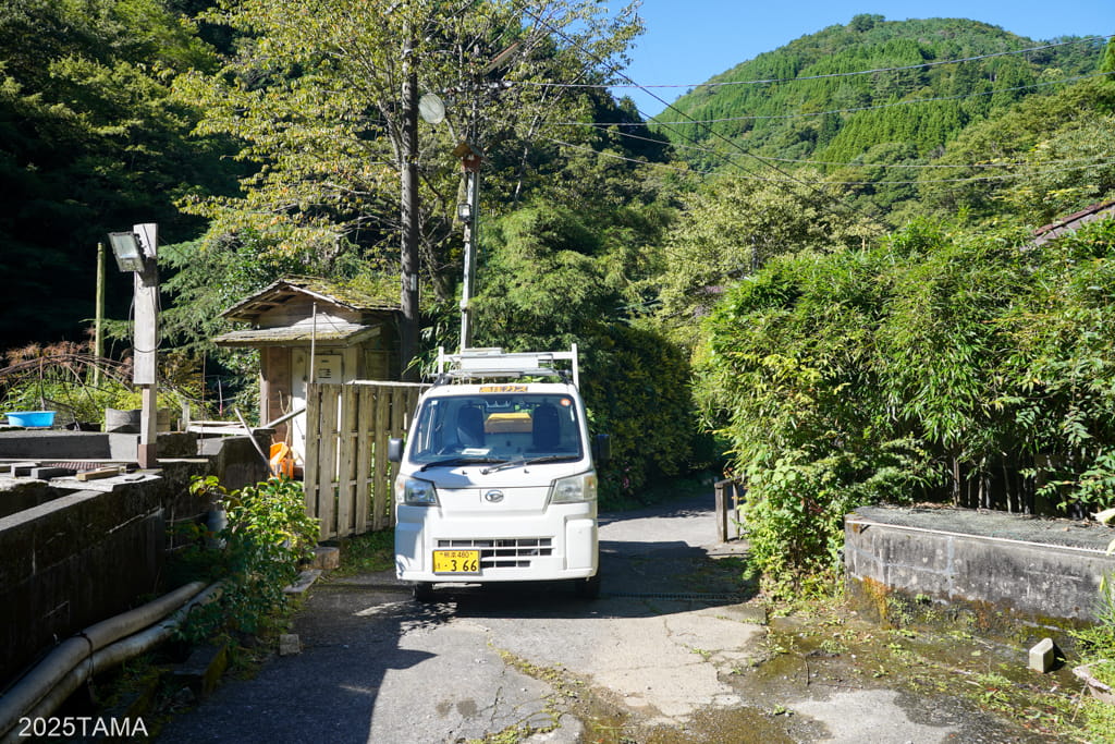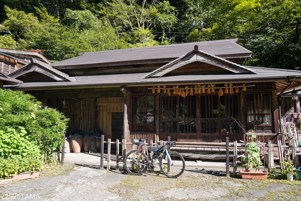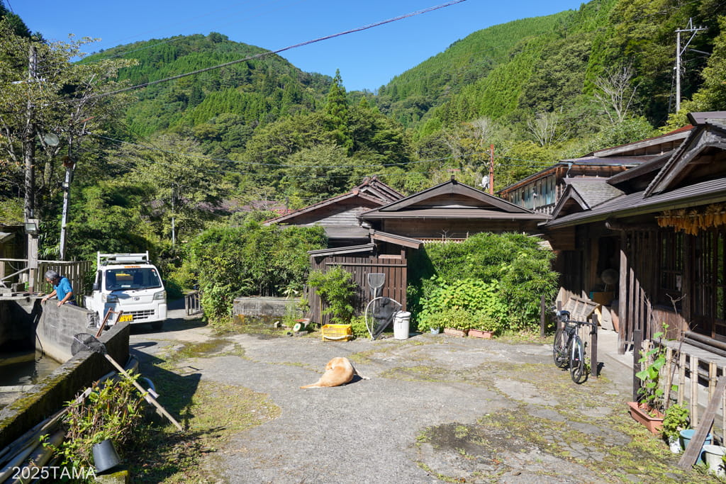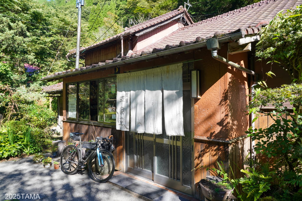 しかし本当に辛いのは二本杉峠を越えた先の国道445号からの分岐で、お堂がある腰越峠まで細い道を上り、そこからコンクリート舗装の坂を谷まで一気に下ることになりました(つまり二本杉峠を超えて終わったと喜んでいると絶望する羽目になる)。途中の建物には放し飼いを含めて犬が3匹もいて吠えられたし、車が無難です。改めて見てみても本当にとんでもない場所に宿が建っている。