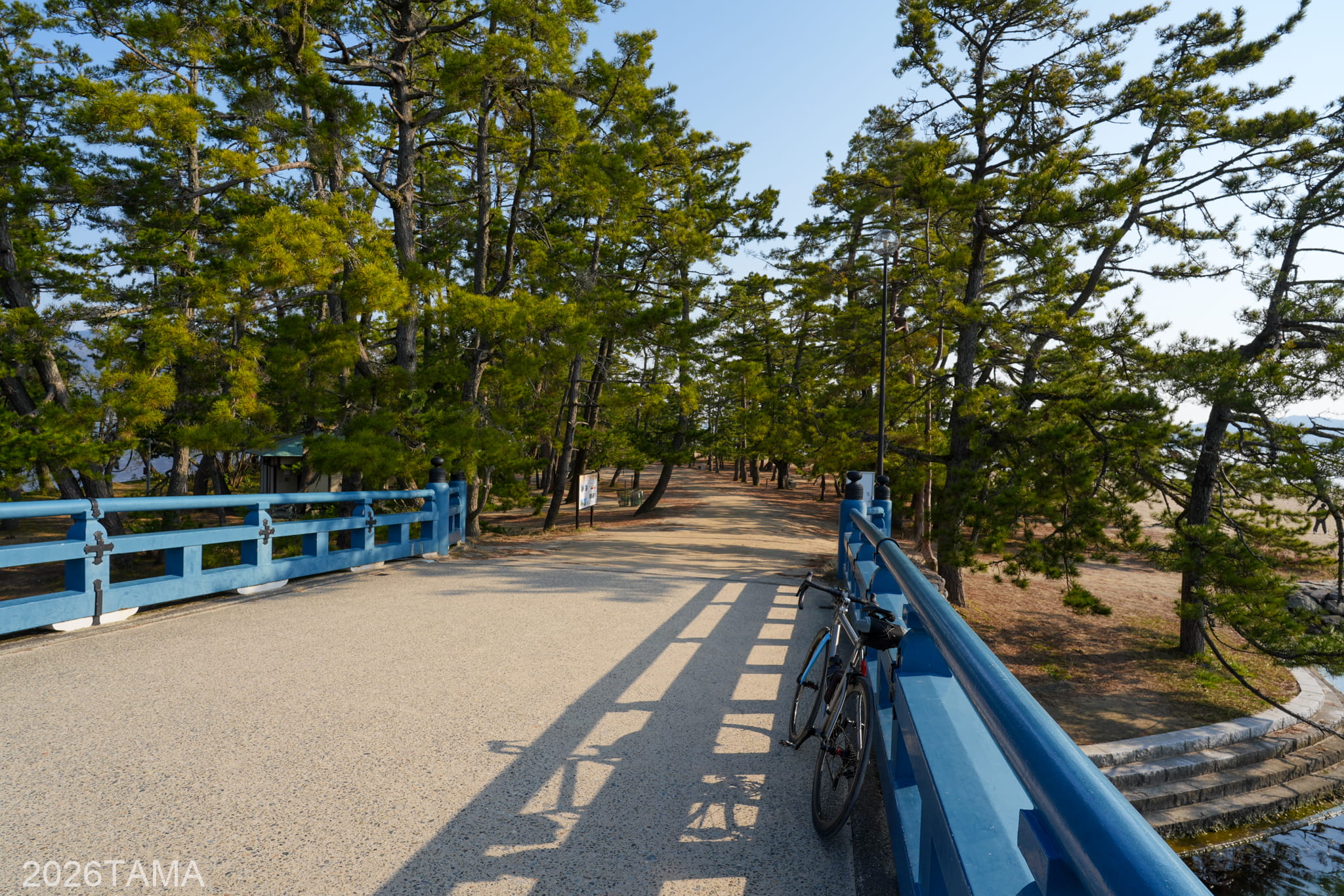 車道を通って伊根の舟屋方面に行くのであれば県道2号から国道178号へと走る必要があり、市町村も宮津市~与謝野町~宮津市という風に切り替わります。しかし天橋立は歩行者と自転車は通行できる(府道天の橋立線)ため、この天橋立を通過することでショートカットすることが可能です。なんて素敵なんだ…。