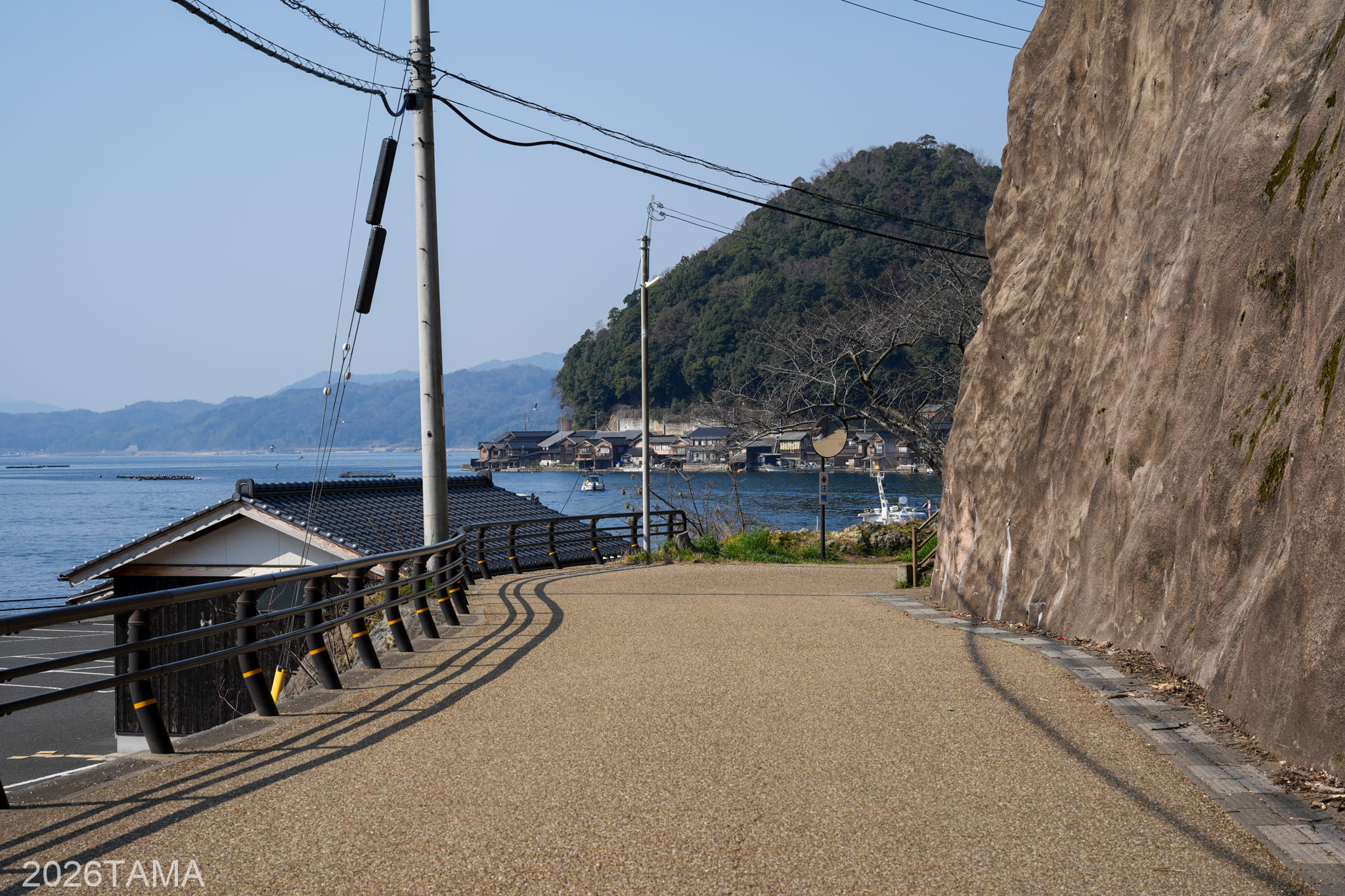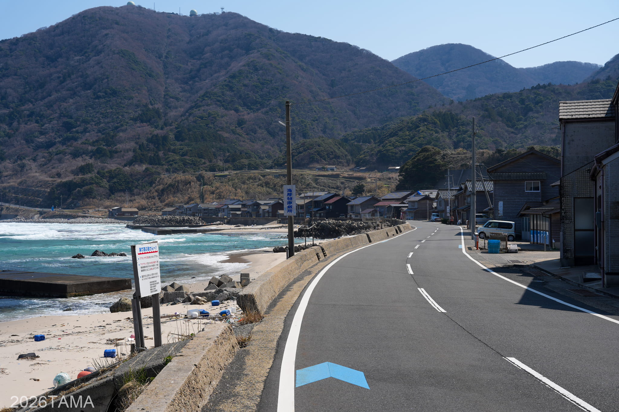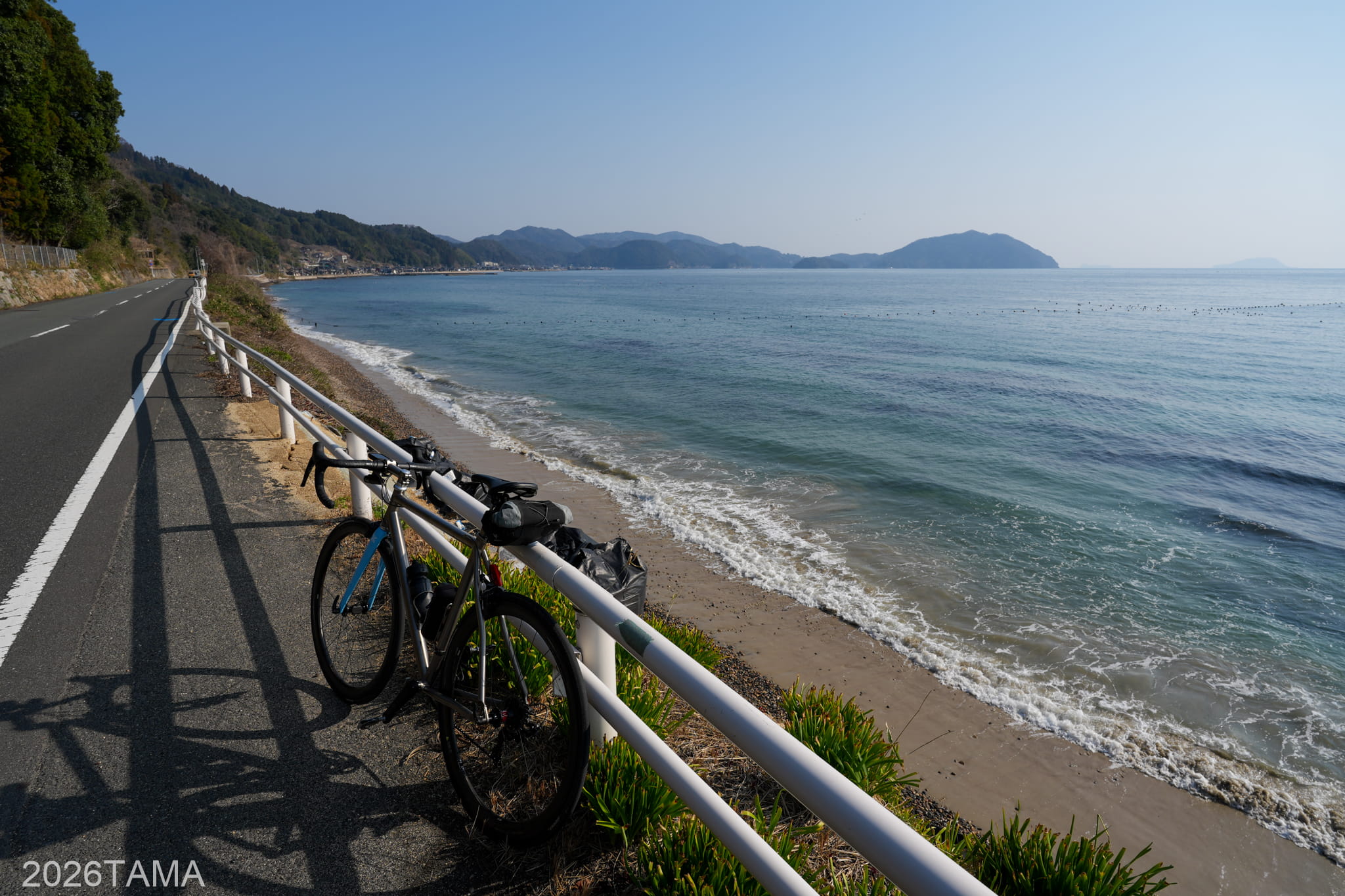 なお丹後半島において海のすぐ脇が海になっている箇所はそう多くなく、道と海との間に陸地がある場合がほとんどです。そういう意味では、スタートして間もないタイミングで絶妙な場所に巡り合うことができた。