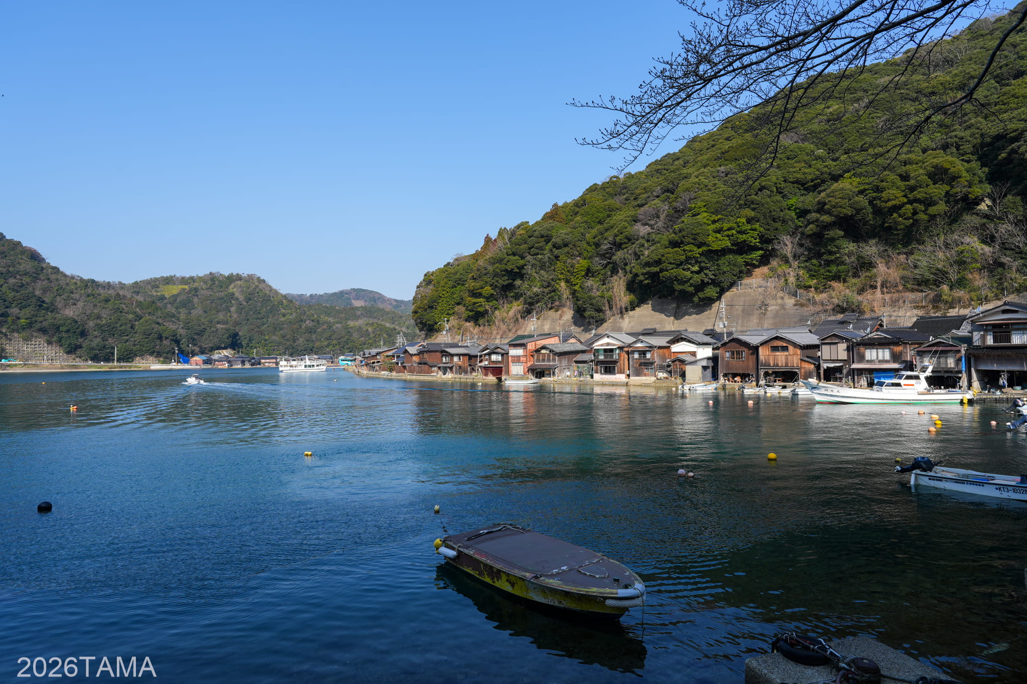 国道178号から海沿いの道へと移り、大島の舟屋~伊根町日出の舟屋を経て町並みの中心部へ。丹後半島を代表する重要伝統的建造物群保存地区「舟屋」の景観が徐々に現れてくる。