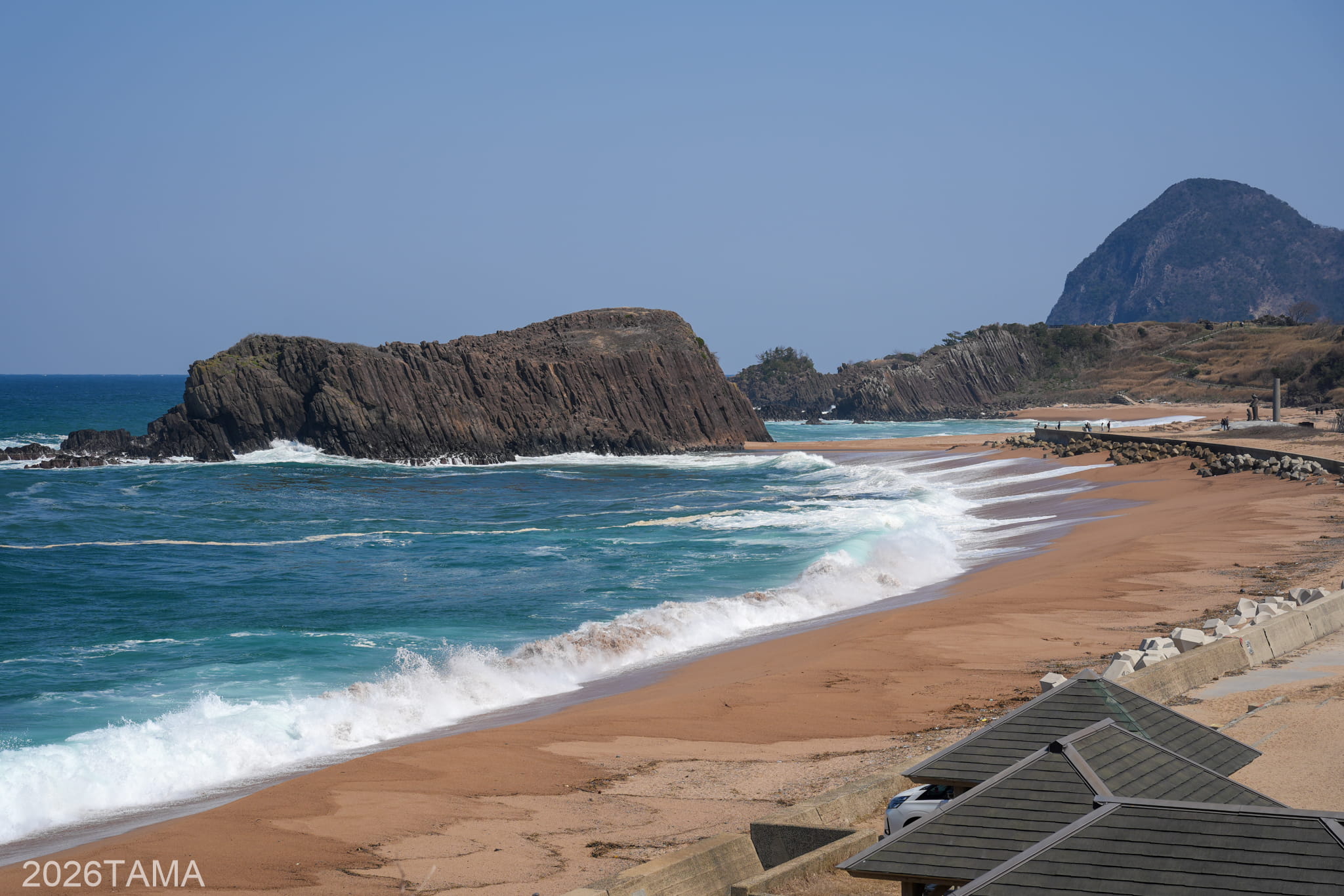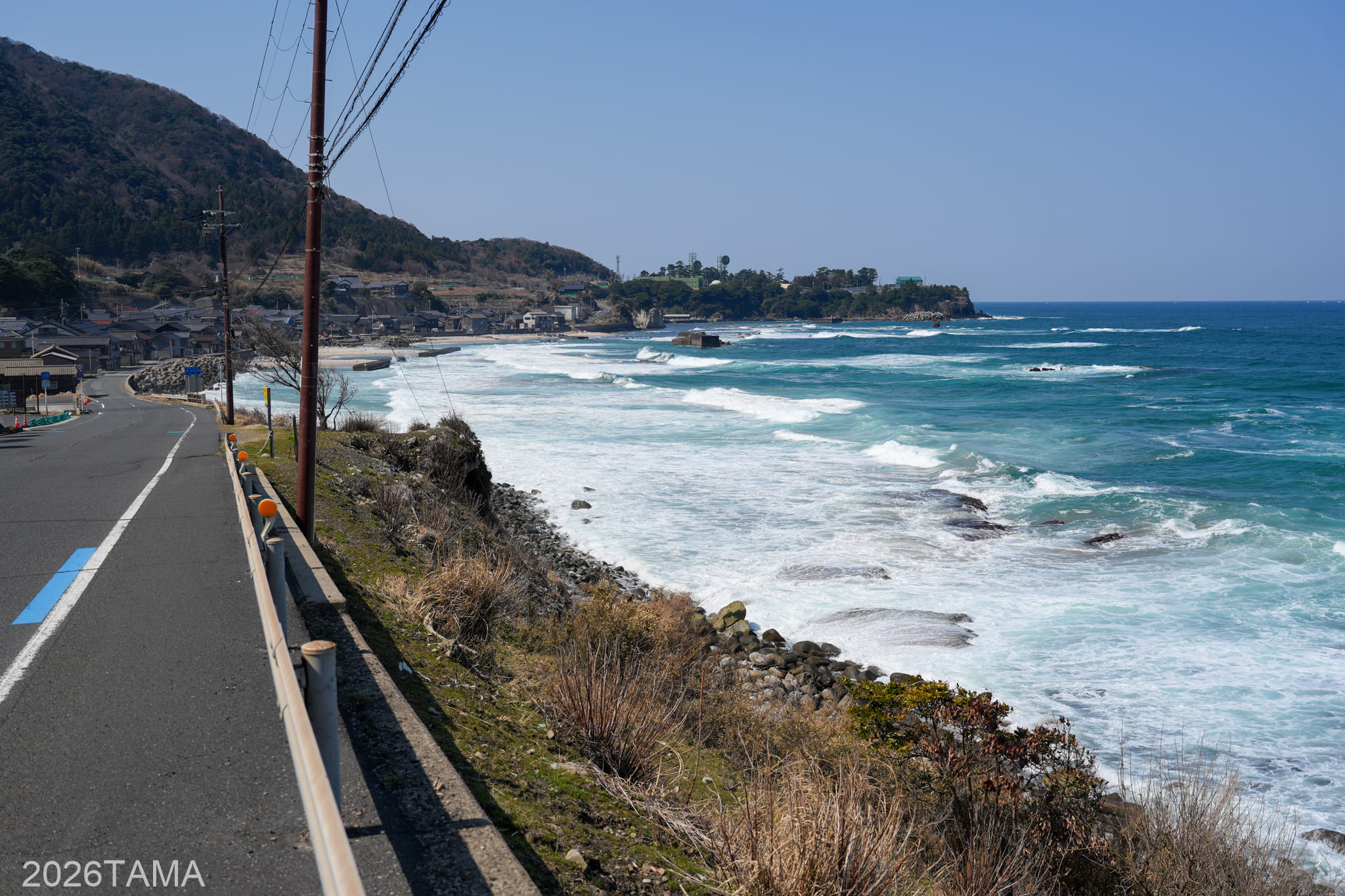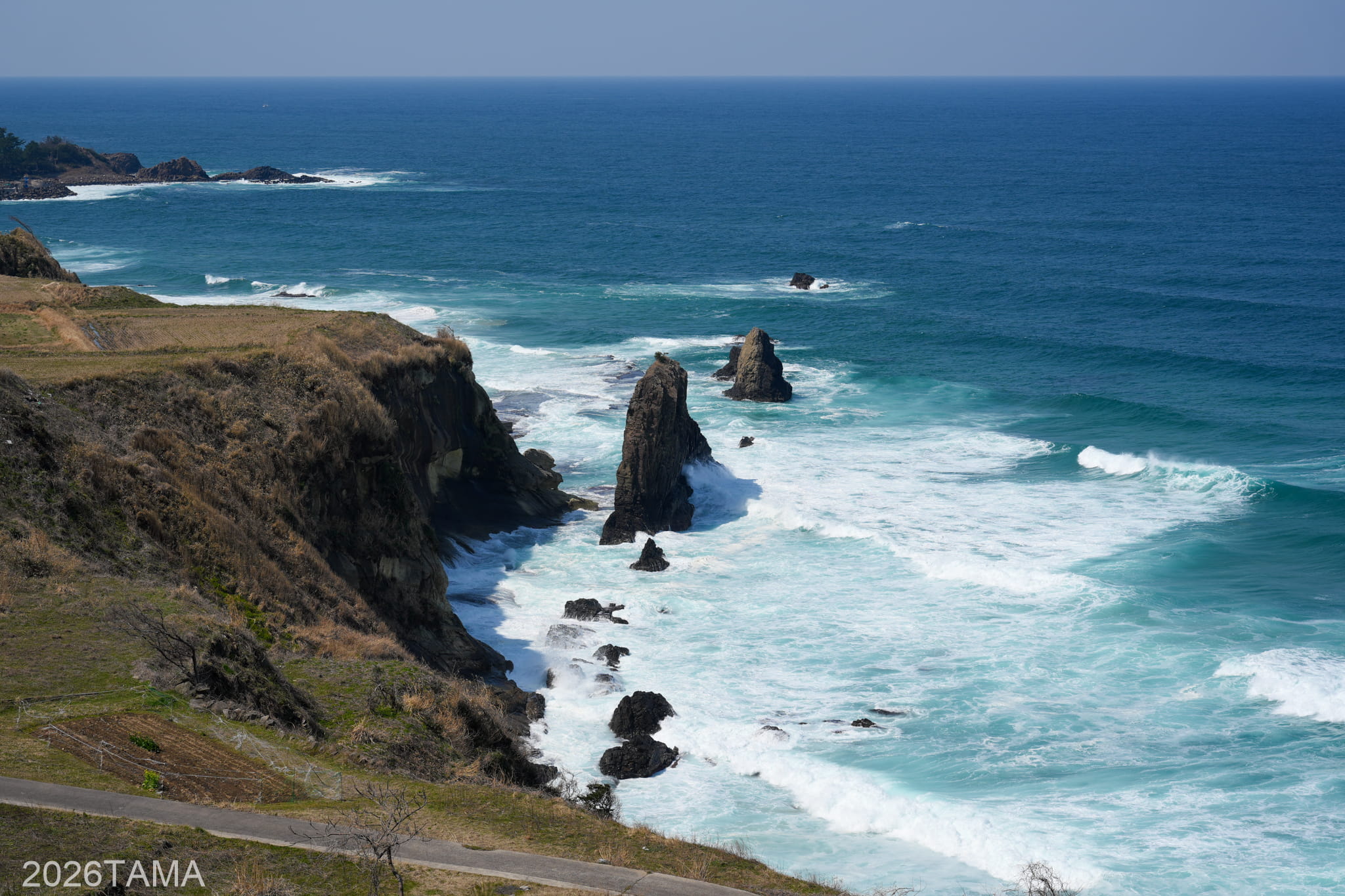 前回訪問時に感動した蒲入展望所とカマヤ海岸では、進行方向側に日本海の荒波が見えてくるのが印象的でした。落ちたら簡単に天国へ行けそうなほど高低差があって、岩ばかりの崖に道が通っているのは見事というほかない。
